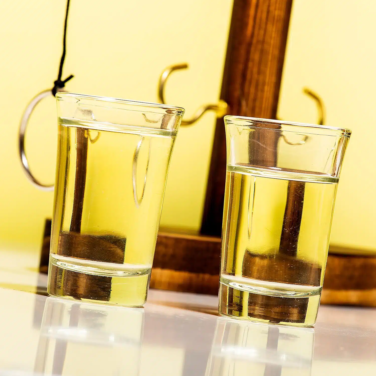 - Mit zwei Schnapsglรคsern.