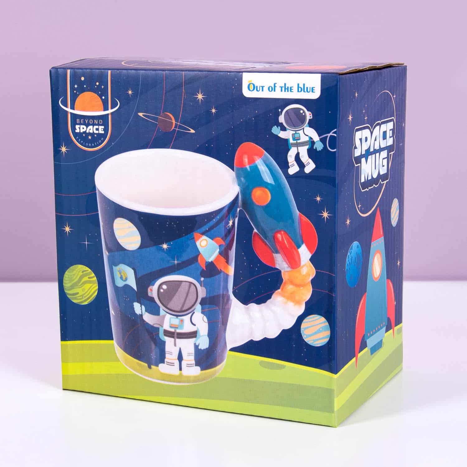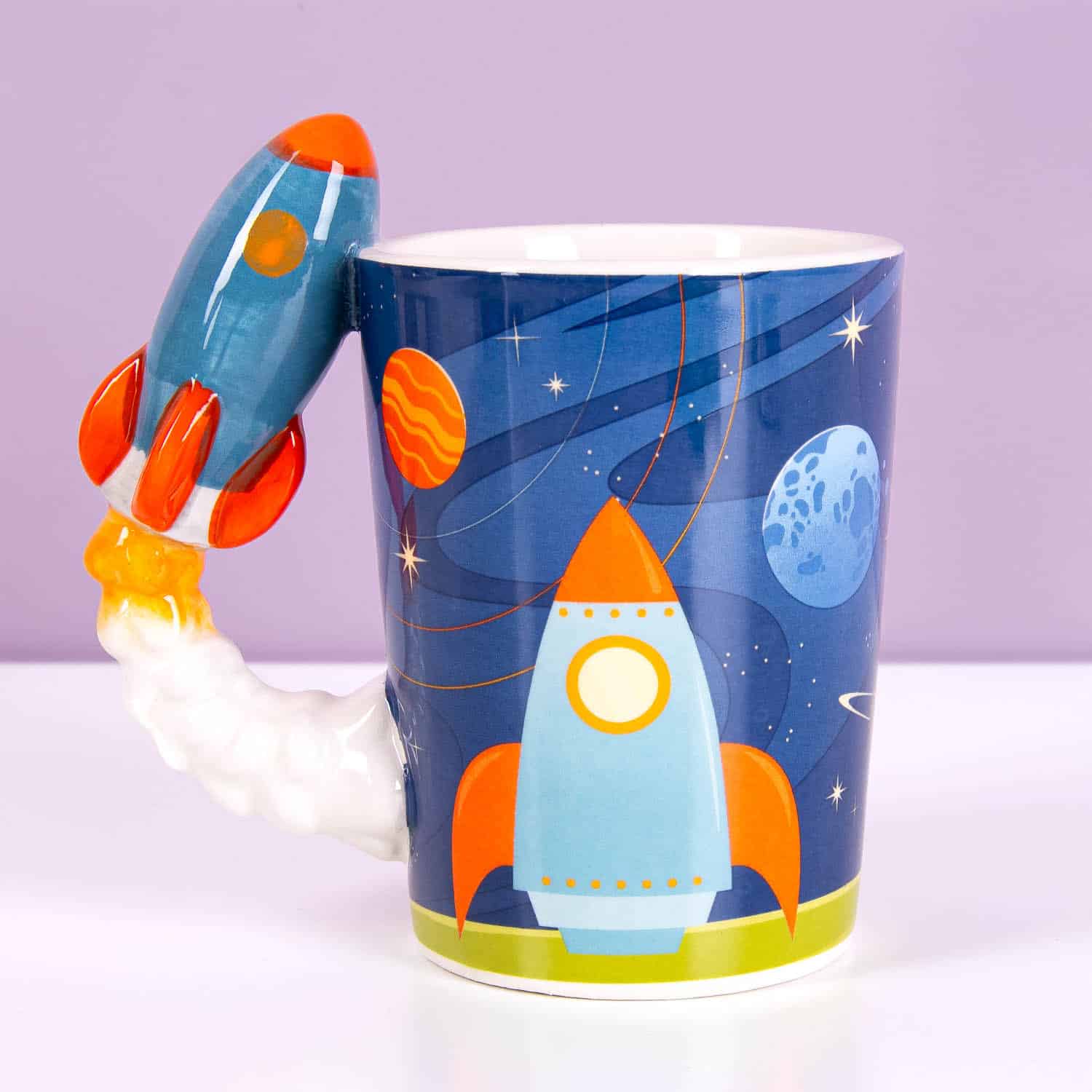 Tasse mit Weltraumthema und Henkel in Raketenform