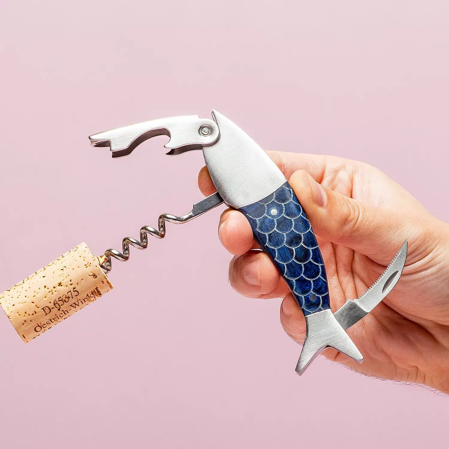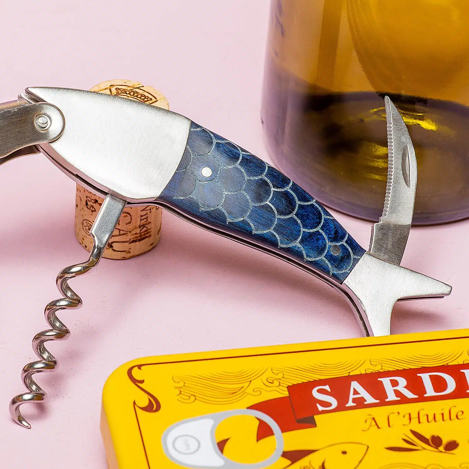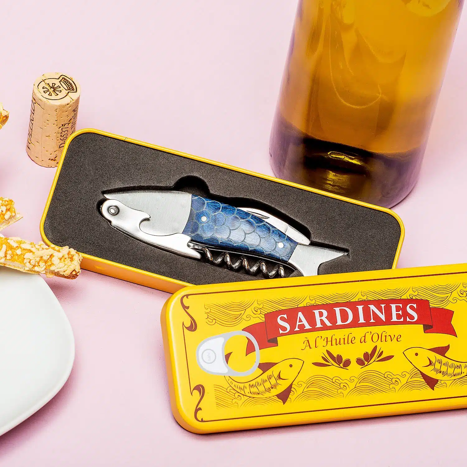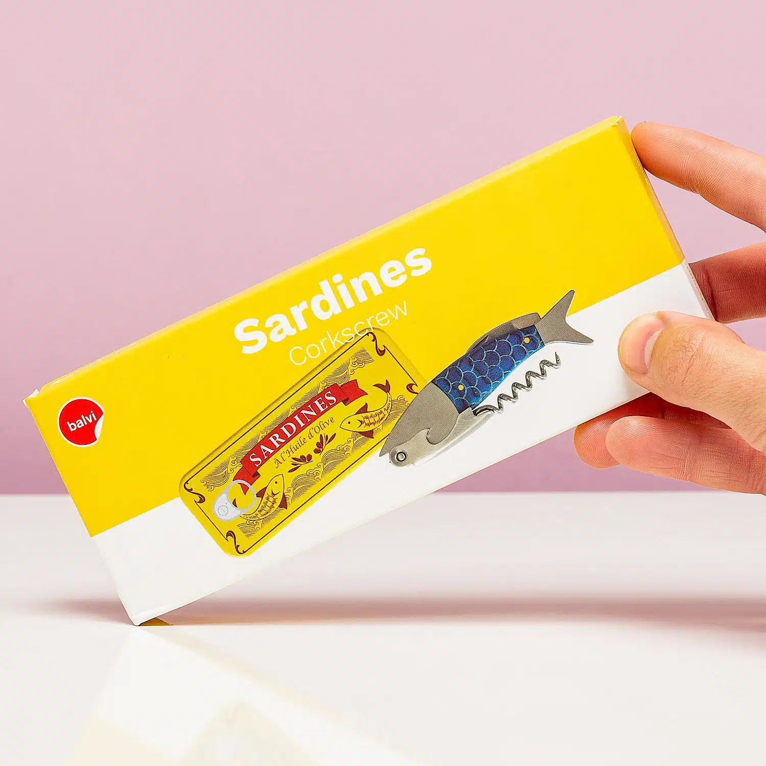 Was ist dein Fang des Tages: eine gute Flasche Rotwein oder doch lieber WeiรŸwein? Mit dem Sardinen Korkenzieher von Balvi hast du immer einen guten Grund, eine leckere Flasche zu รถffnen. Dieser Korkenzieher ist nicht nur witzig, sondern auch praktisch: Mit seiner scharfen Spitze zieht er jeden Korken im Handumdrehen aus der Flasche. Party feiern? Auf dem Tisch fรผhlt sich dieser Fisch pudelwohl. Aber er macht sich auch gut als Geschenk, dank der Blechdose, in der er verpackt ist. Neben einem Korkenzieher befinden sich auch ein Folienschneider und ein Flaschenรถffner darauf.