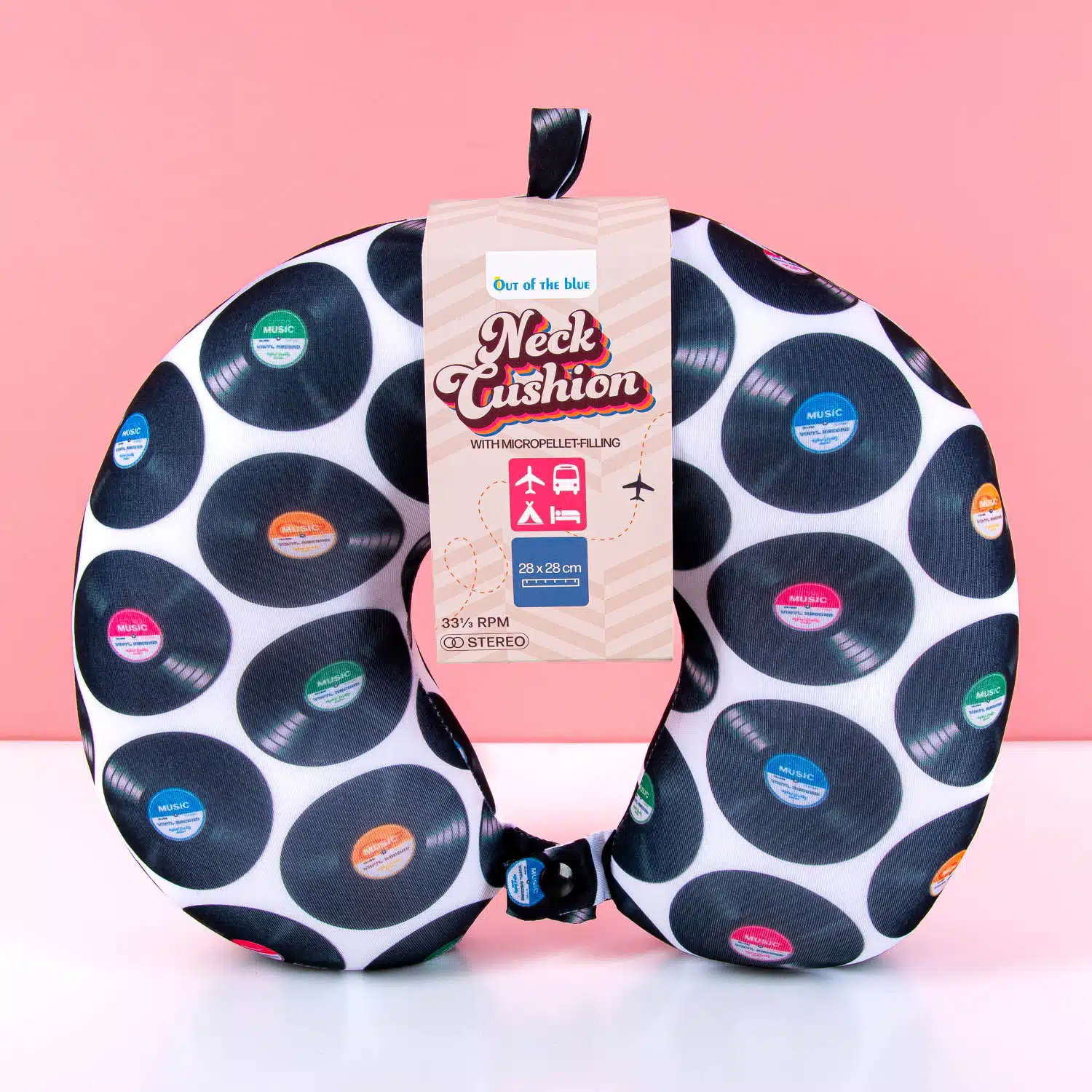 Das Schallplatten-Nackenkissen sorgt dafür, dass du unterwegs besonders bequem reist. Auf dem Stoff sind Abbildungen von Schallplatten zu sehen. Das weiche Kissen mit Mikro-Perlen-Füllung bietet Unterstützung auf Reisen und beim Nickerchen.