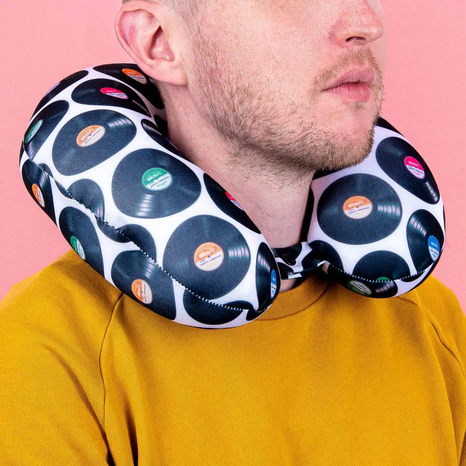 Das Schallplatten-Nackenkissen sorgt dafรผr, dass du unterwegs besonders bequem reist. Auf dem Stoff sind Abbildungen von Schallplatten zu sehen. Das weiche Kissen mit Mikro-Perlen-Fรผllung bietet Unterstรผtzung auf Reisen und beim Nickerchen.