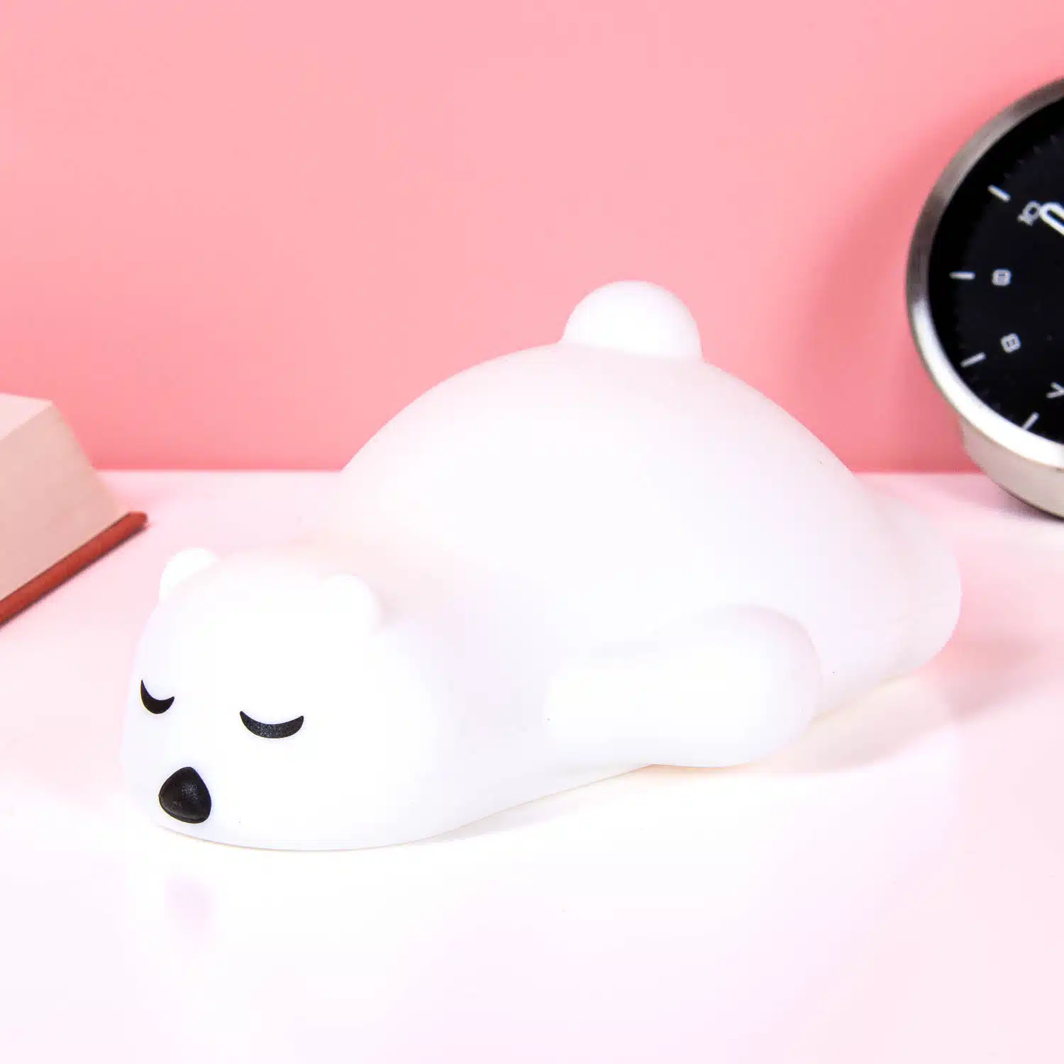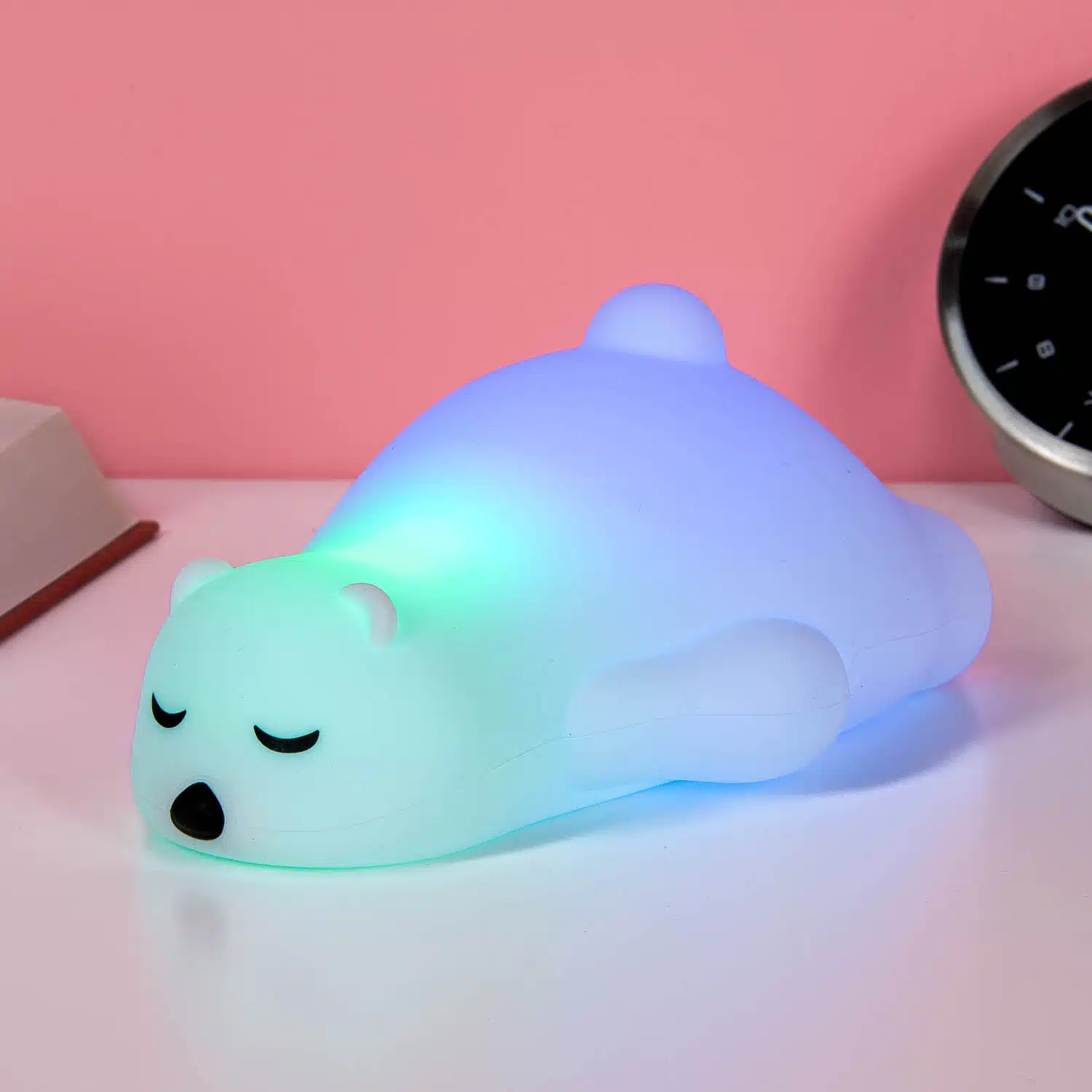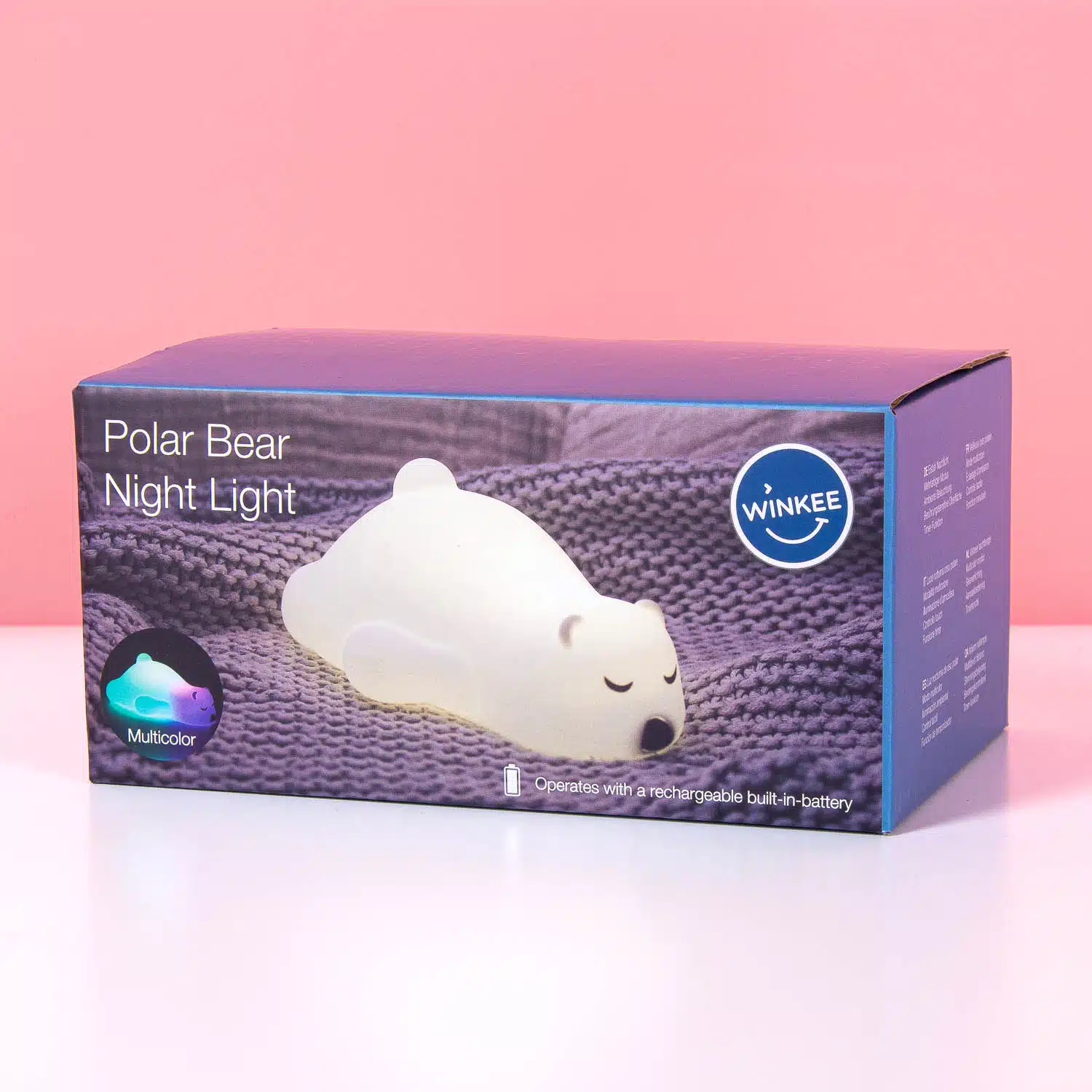 Das Schlafende Eisbär-Nachtlicht von Winkee ist ein weiches Silikon-Nachtlicht in Form eines schlafenden Eisbärchens. Berühre es, um zwischen Farbmodi zu wechseln, und tippe während des Farbwechsels, um deine Lieblingsfarbe festzuhalten. Perfekt um dein Kind ruhig einschlafen zu lassen oder als Nachtlicht, das die ganze Nacht an bleiben kann. Aufladen via USB, also keine Batterien nötig. Schönes Nikolausgeschenk oder einfach weil dein Kind ein süßes Eisbärchen verdient!