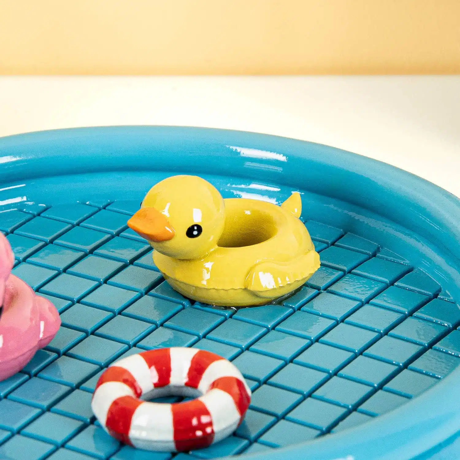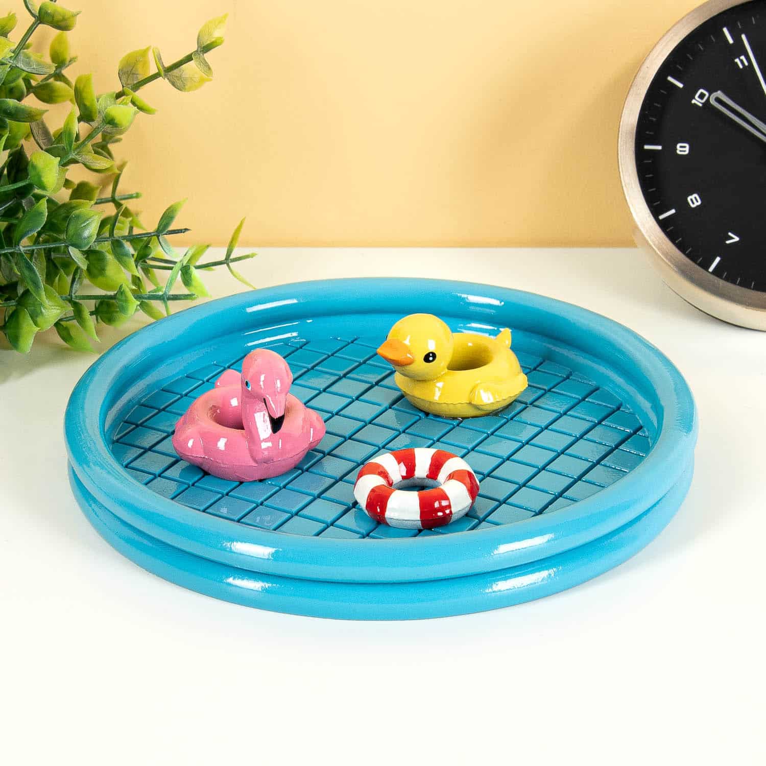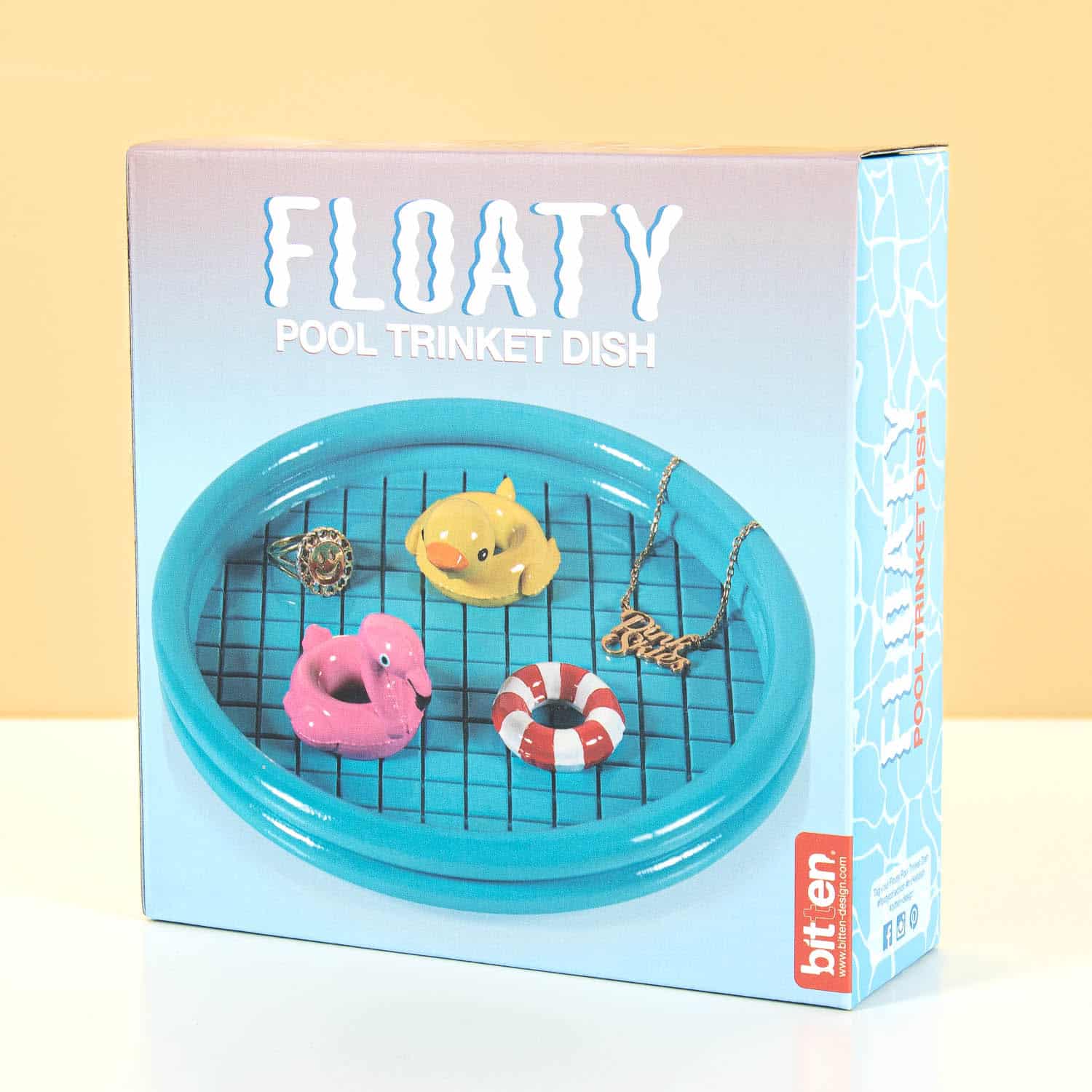 Mit dem Schwimmbad Schmuckschälchen von Bitten findest du deine Schmuckstücke nicht nur leicht wieder, es sieht auch noch fröhlich aus. Dieses Schälchen ist perfekt für deine kleinen Schätze – von Piercings und Ohrringen bis hin zu deinem Schlüsselbund. Das Schmuckschälchen sieht aus wie ein Schwimmbad: sogar kleine Schwimmringe treiben darin!
