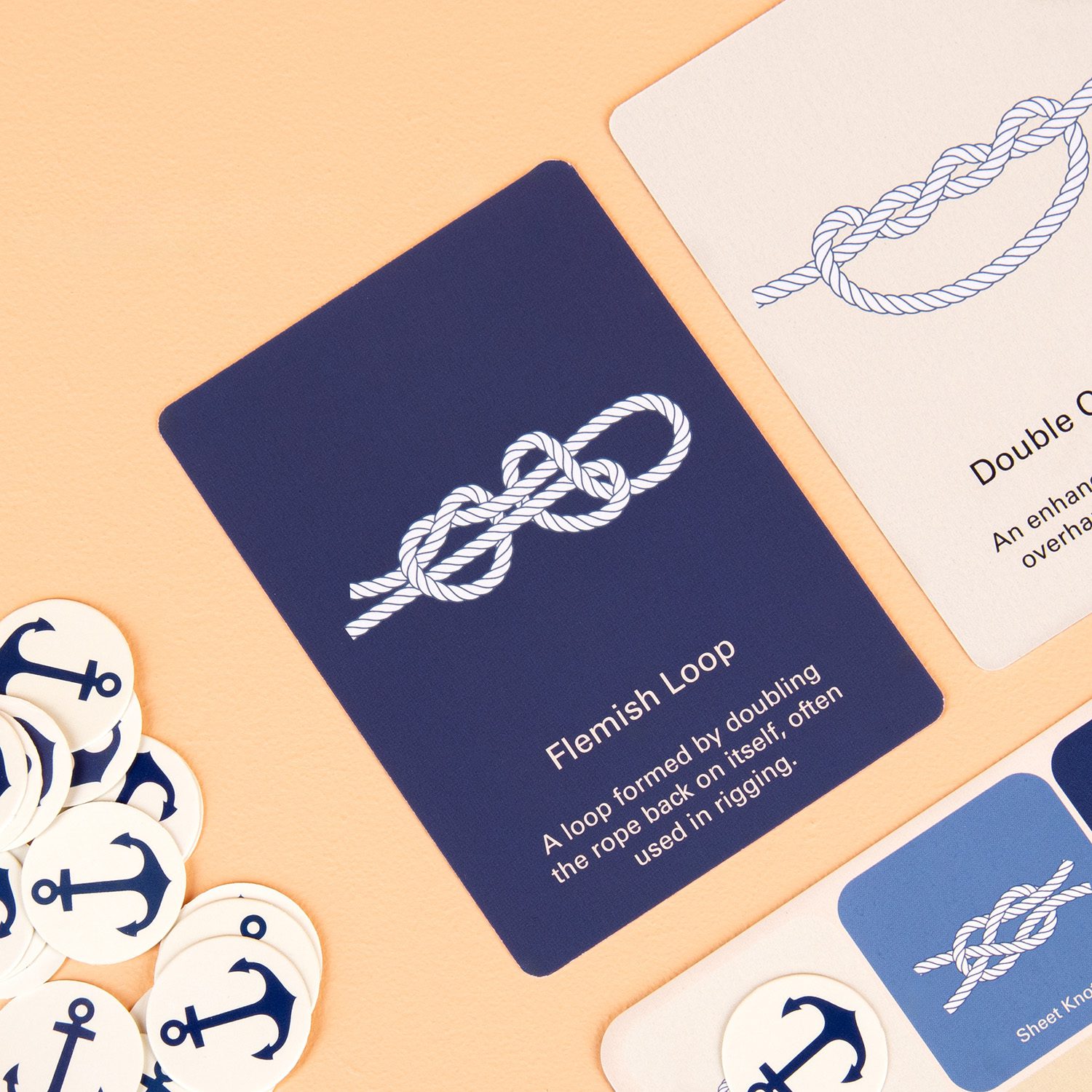 Vergiss die langweiligen Zahlen: Ab jetzt spielst du Bingo mit Knoten! Nicht die Knรถpfe an deiner Jacke, sondern echte Seemannsknoten und -stiche. Der Spielleiter zieht eine Karte, die du auf deiner Bingokarte suchen musst. Hast du sie gefunden, legst du ein Spielstรผck mit Anker darauf. Wer als Erster seine Karte voll hat, gewinnt. Aber pass auf, wenn du zu frรผh โBingoโ rufstโฆ dann musst du singen!