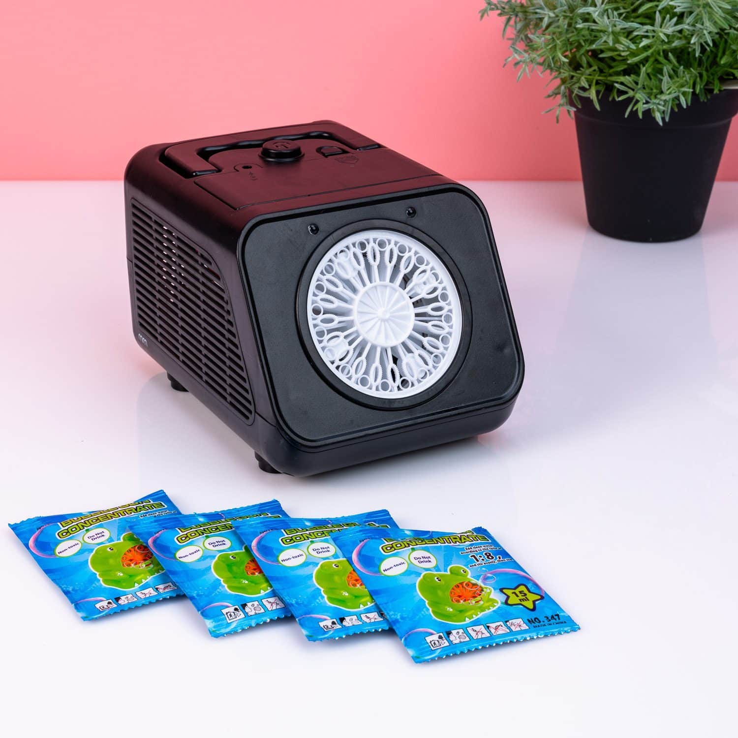 • Wird mit vier Beuteln Seifenblasenflรผssigkeit geliefert