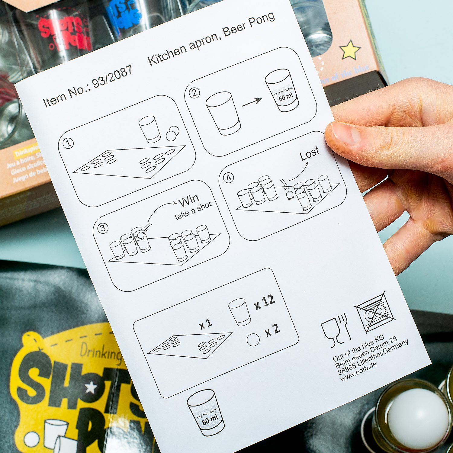 - Kommt mit Spielfeld, zwรถlf Schnapsglรคsern und zwei Bรคllen