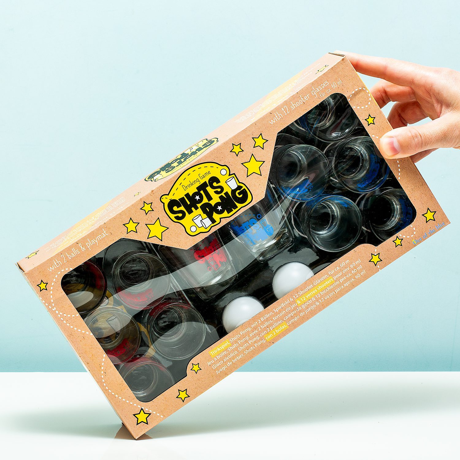 Ist ein Bierpong-Tisch zu groร fรผr dein Studentenzimmer, aber du mรถchtest dir trotzdem einen schรถnen Abend machen? Dann spielen Sie das Trinkspiel Shots Pong von Out of the Blue. Dieses Spiel ist von Beer Pong inspiriert, aber mit Schnapsglรคsern. Sie erhalten zwรถlf Schnapsglรคser mit rotem und blauem Aufdruck,zwei Bรคlle und ein Spielfeld.