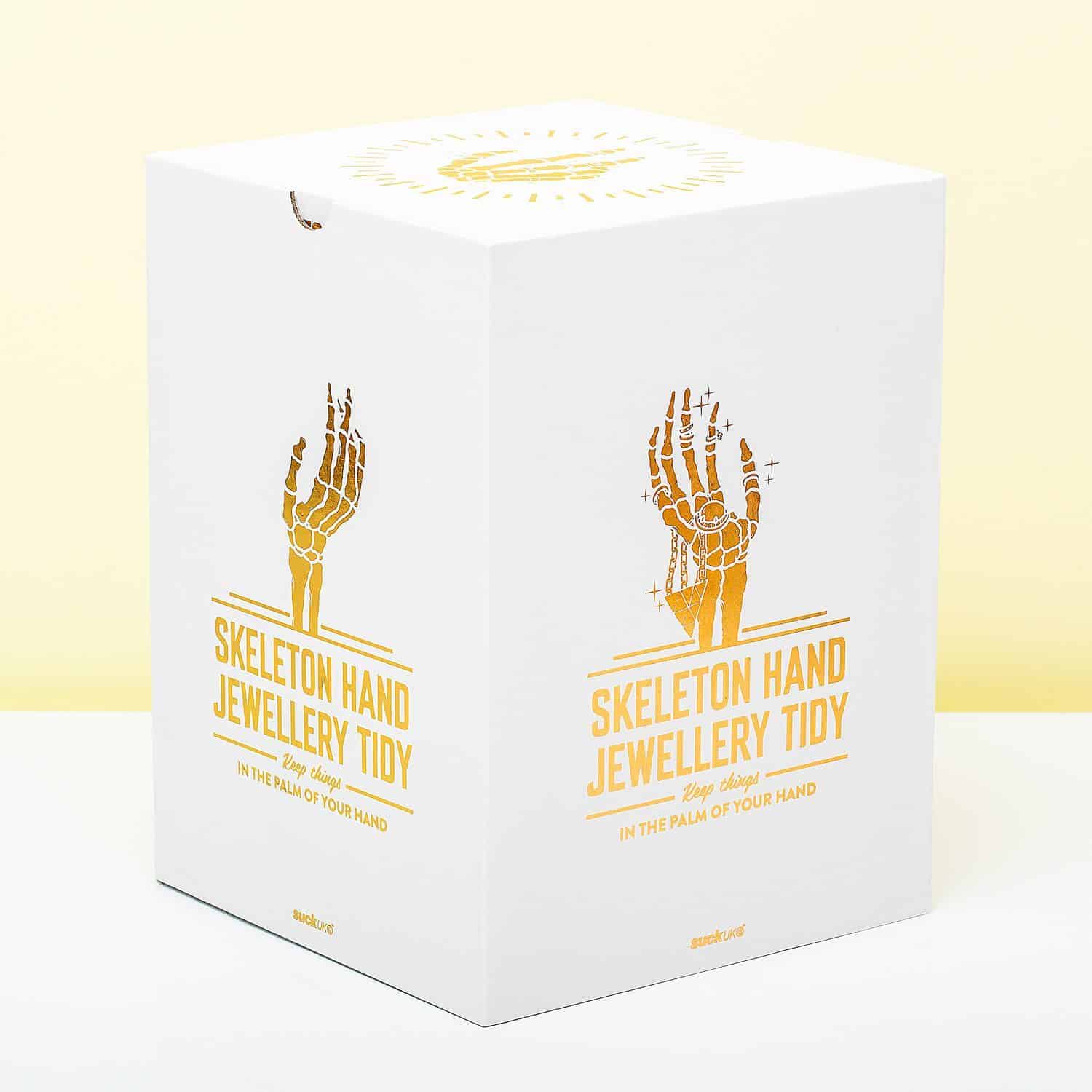 Es kann ein kleiner Schock sein, wenn Sie aufwachen und Ihren brandneuen Skeleton-Handschmuckhalter von Suck UK auf Ihrem Nachttisch vorfinden. Zum Glück dauert es nicht allzu langedenn sobald Sie Ihren Schmuck an Ihren Fingern hängen sehen, wissen Sie es wieder: Diese Hand ist einfach der neue Aufbewahrungsort für Ihre schönsten Ringe, Ohrringe und sonstigen Schmuck. Die schwarze Hand sieht aus wie die eines Skeletts, montiert auf einer Buchenholzschale.