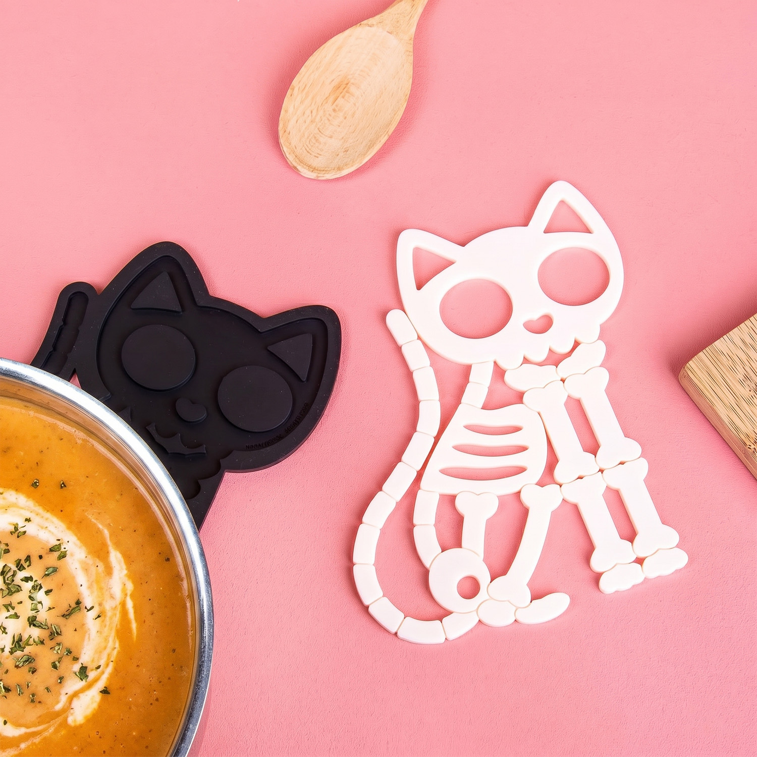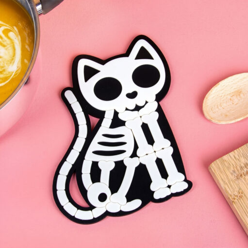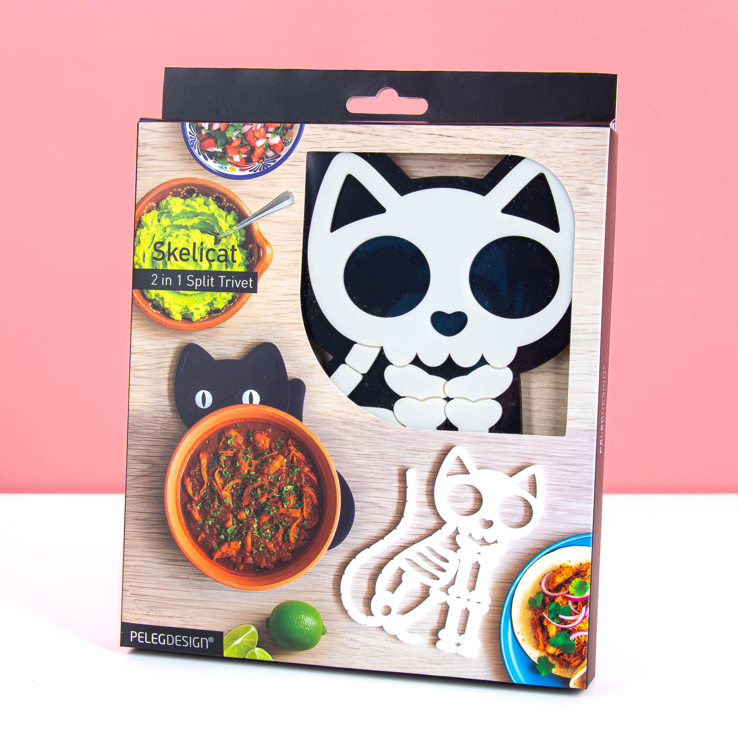 Auf den ersten Blick ist der Skelicat Untersetzer von Peleg Design einfach ein witziger Untersetzer in Katzenform โ aber zieh die zwei Teile auseinander und es erscheint eine skelettfรถrmige Katze: ein weiรes Skelett und eine schwarze Katze, die du zusammen oder einzeln verwenden kannst.
