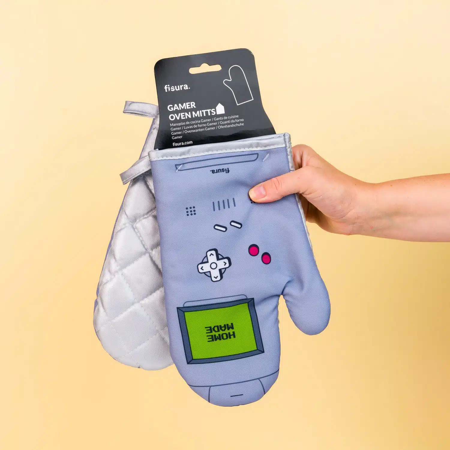 Erwecken die Fisura Spielekonsolen-Ofenhandschuhe (2er-Set) bei Ihnen sofort ein Gefühl der Nostalgie? Jeder, der in den 90er Jahren mit dem GameBoy gespielt hat, wird den ikonischen Look erkennen, der diesen Ofenhandschuhen zugrunde liegt. Spielen kann man damit aber nicht: Sie dienen vor allem dazu, die Hände zu schützen, wenn man den Kuchen aus dem Ofen nimmt. Die Ofenhandschuhe werden im 2er-Set geliefert.