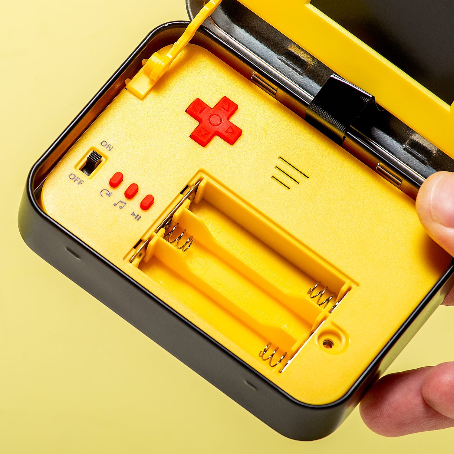 - Handliche, kompakte Spielkonsole in einer Dose zum Mitnehmen