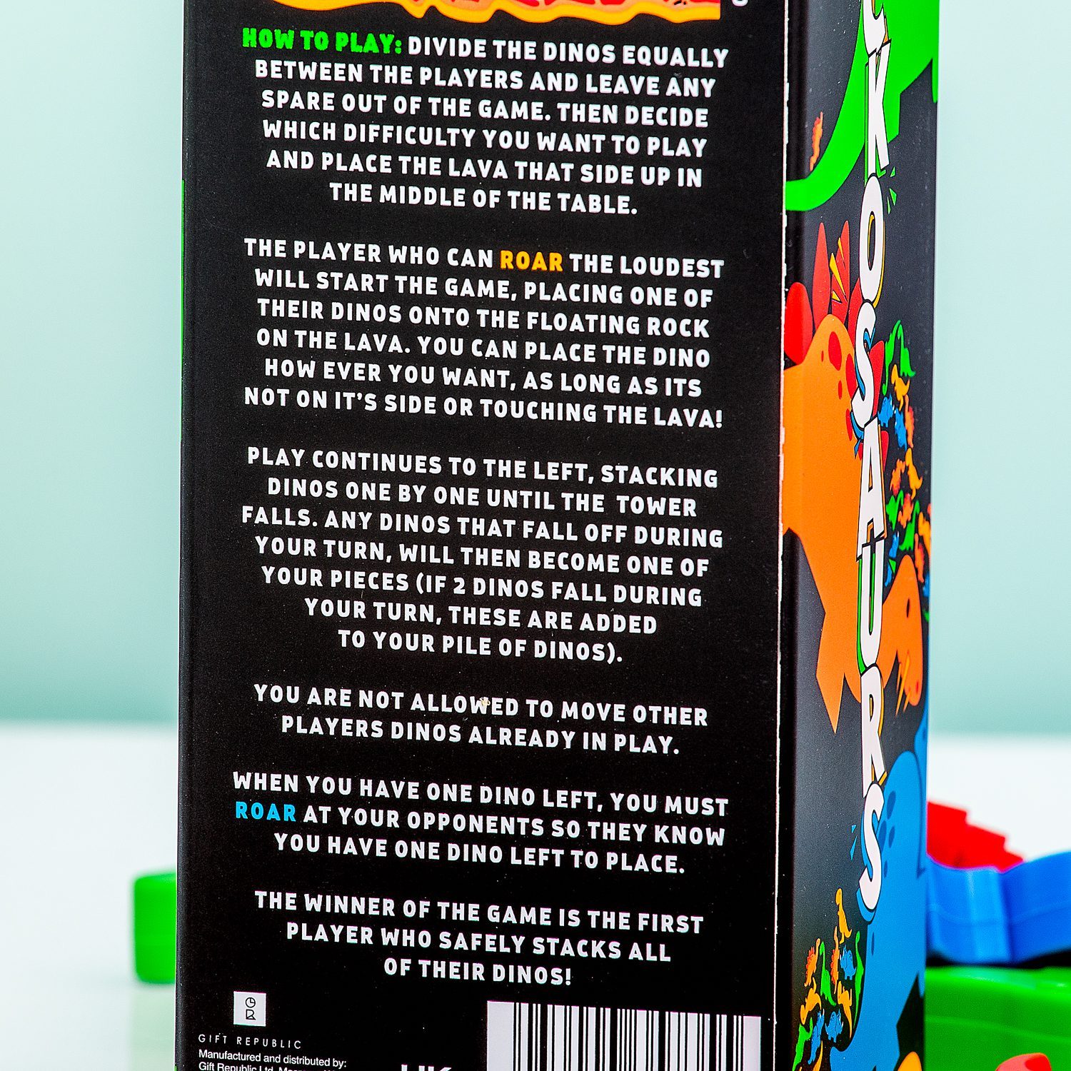 Fรผr das Stapelspiel Stackosaurus von Gift Republic brauchst du eine ruhige Hand. Das Letzte, was Sie wollen, ist, die Dinosaurier zum Aussterben zu bringen. Deshalb stapelt ihr sie so weit wie mรถglich, um zu verhindern, dass sie die Lava auf dem Spielfeld treffen. Wer den Dinosaurierhaufen umwirft, verliert das Spiel.Ein lustiges Spiel fรผr Jung und Alt, das man auch alleine spielen kann.