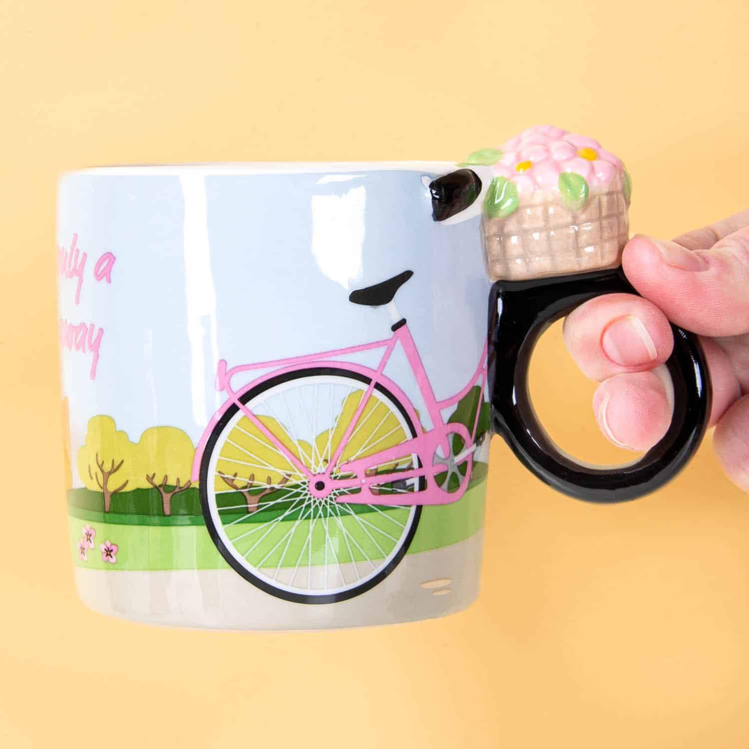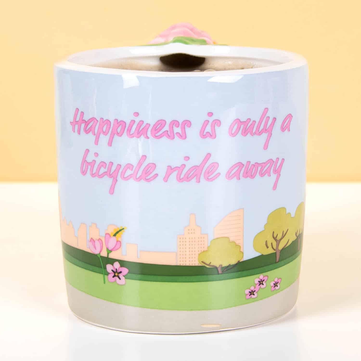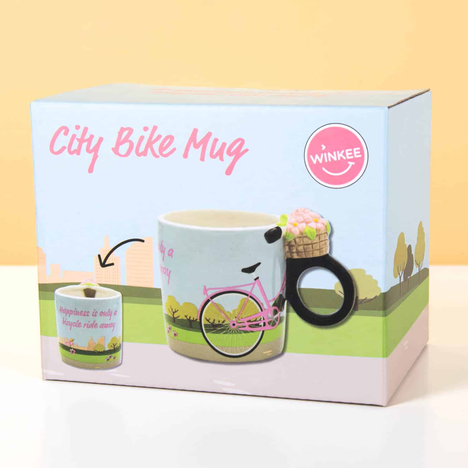 Die Stadtrad-Tasse von Winkee ist eine frรถhliche Tasse mit einem Fahrrad darauf, wobei das Vorderrad clever als Henkel der Tasse dient. Komplett mit einem Fahrradkorb voller Blumen und dem Zitat „Happiness is only a bicycle ride away“. Perfekt fรผr Fahrradliebhaber, stรคdtische Abenteurer oder jeden, der seinem Morgenkaffee mehr Joy geben will. Diese Tasse macht deinen Kaffee sofort lustiger, auch wenn du selbst nie weiter als zum Supermarkt radelst. Zwei Rรคder, eine tolle Tasse!