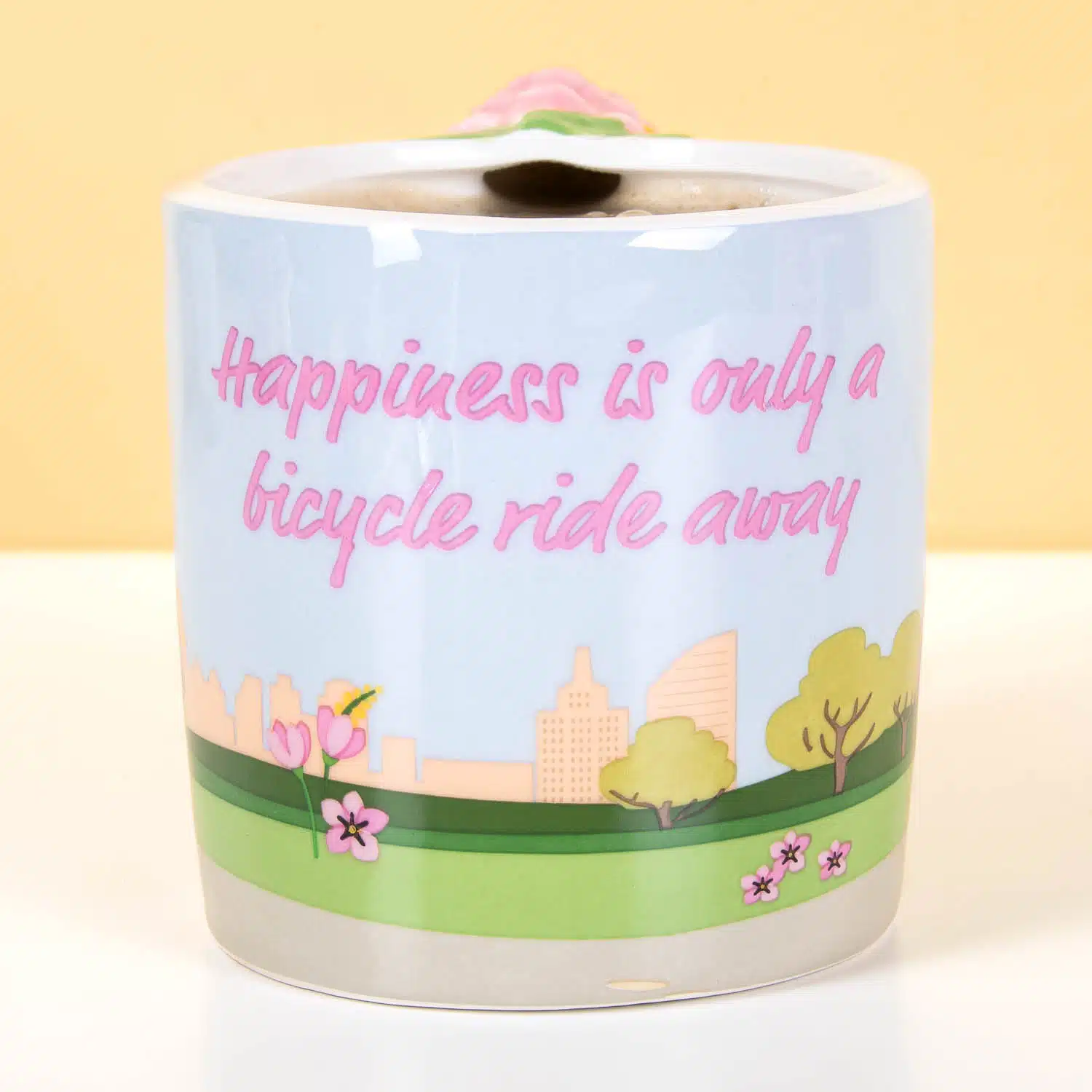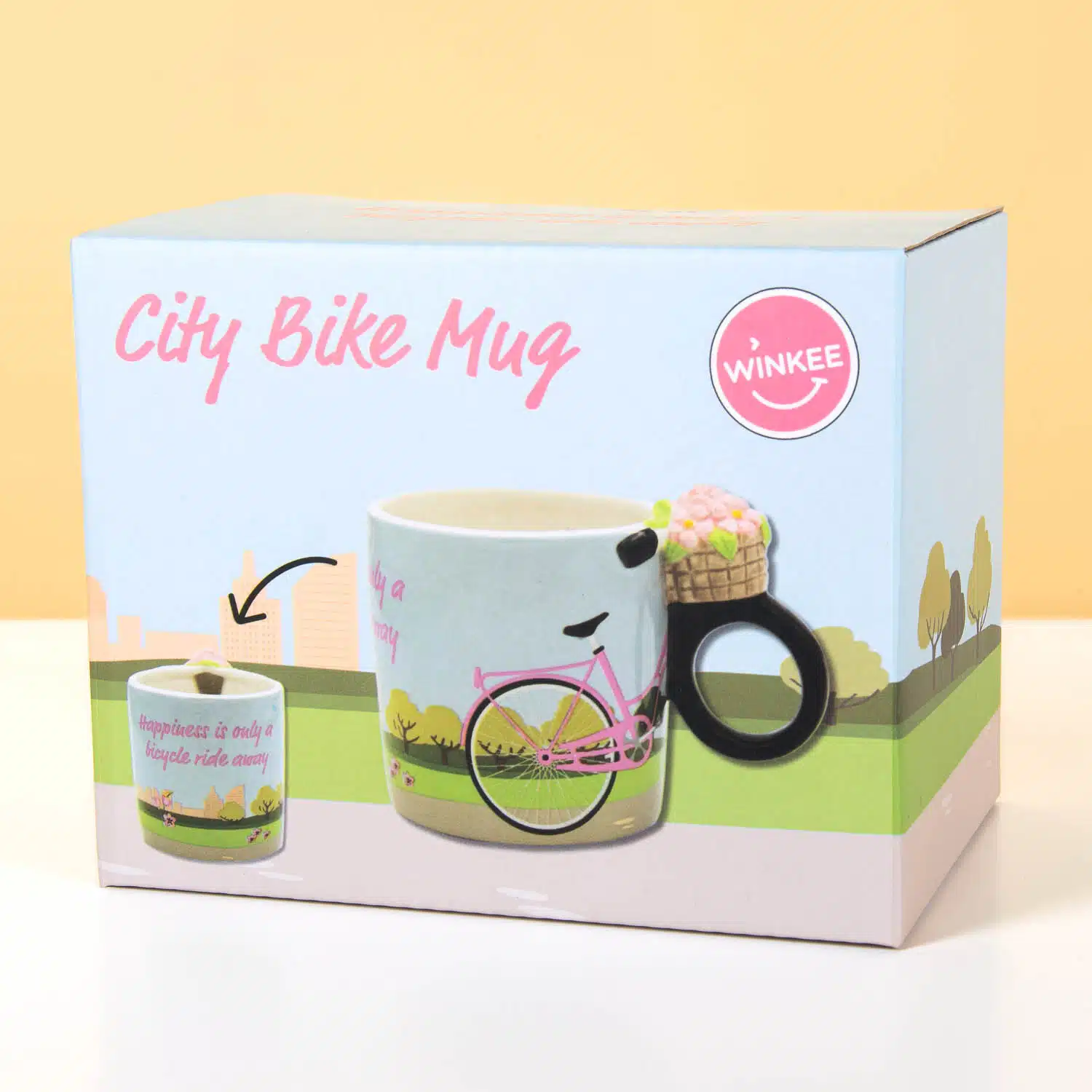 Die Stadtrad-Tasse von Winkee ist eine frรถhliche Tasse mit einem Fahrrad darauf, wobei das Vorderrad clever als Henkel der Tasse dient. Komplett mit einem Fahrradkorb voller Blumen und dem Zitat “Happiness is only a bicycle ride away”. Perfekt fรผr Fahrradliebhaber, stรคdtische Abenteurer oder jeden, der seinem Morgenkaffee mehr Joy geben will. Diese Tasse macht deinen Kaffee sofort lustiger, auch wenn du selbst nie weiter als zum Supermarkt radelst. Zwei Rรคder, eine tolle Tasse!