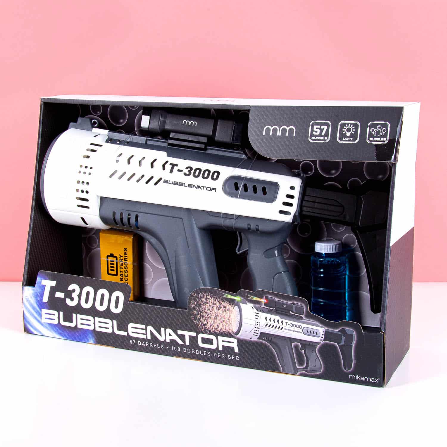 Eine Kinderparty, Hochzeit oder coole Poolparty wird mit der T-3000 Seifenblasenpistole von MikaMax noch besser! Diese leistungsstarke Bubble Gun pustet blitzschnell Seifenblasen aus ganzen 57 รffnungen โ begleitet von einer farbenfrohen Lichtshow fรผr den ultimativen Wow-Effekt. Freu dich auf Hunderte Blasen pro Minute, drinnen wie drauรen!