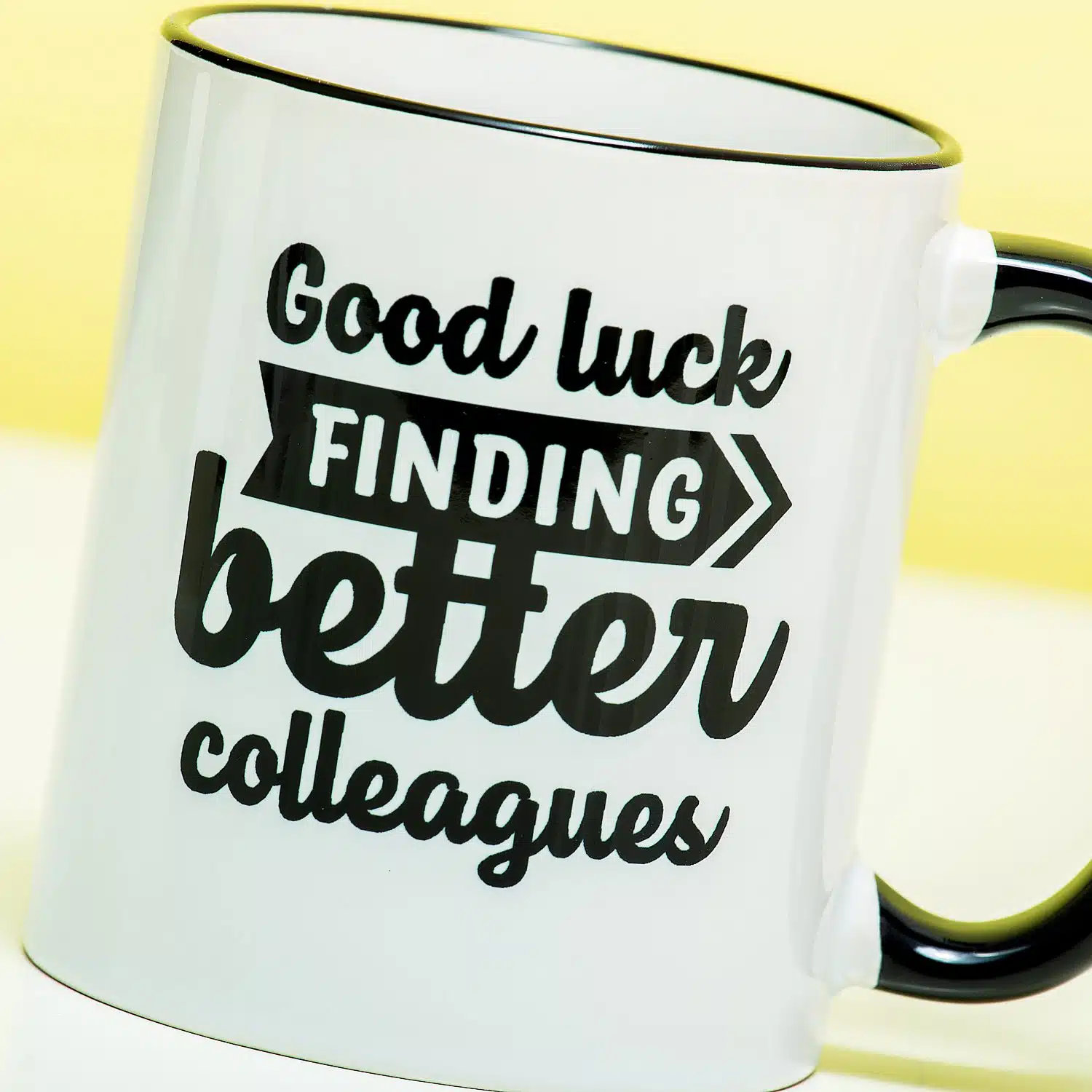 Wenn Ihr bester Kollege einen neuen Job hat, gibt es nur eine angemessene Antwort: Seien Sie so sarkastisch wie mรถglich. Mit dem Becher Better Colleagues gelingt Ihnen das sehr gut. Diese Kaffeetasse trรคgt den Text: โViel Glรผck beim Finden besserer Kollegenโ. So mรผssen Sie Ihre Gefรผhle nicht zeigen und das ist so einfach, oder?