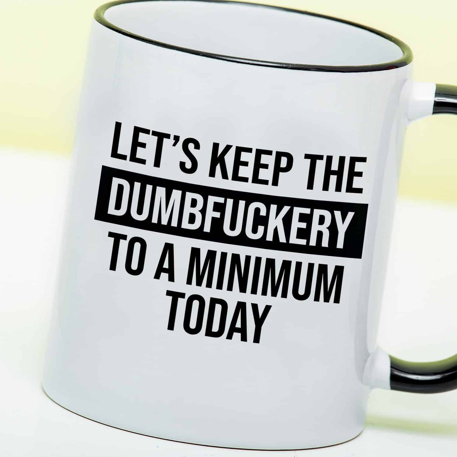 Suchst du eine Tasse fรผr die Arbeit, mit der du deine Kollegen sofort dazu anregst, ihre Arbeit ordentlich zu erledigen? Verwende die Tasse Dumbfuckery. Auf dieser Kaffeetasse steht der Text: Letโs keep the dumbfuckery to a minimum today. Wenn du diese Tasse zu einem Meeting mitnimmst, machst du ohne Worte klar, was Sache ist.