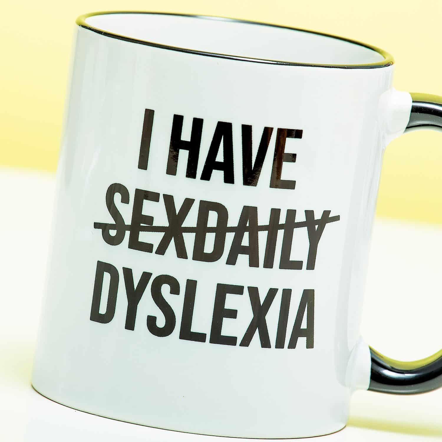 Dyslexie: Wir wollen uns darรผber nicht lustig machen, aber du musst zugeben, dass die Tasse Dyslexie witzig ist. Auf dieser Tasse steht der Text: I have sexdaily. Dabei ist sexdaily durchgestrichen und durch das Wort dyslexia ersetzt.