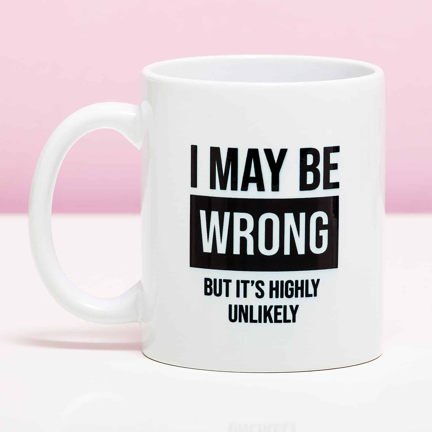 Einen Fehler gemacht? Das muss jemand anderes gewesen sein, denn die Wahrscheinlichkeit, dass du das tust, ist sehr gering. Der Tasse I May Be Wrong ist ein witziger Becher fรผr Menschen, die meinen, sie hรคtten immer recht. Auf dem Becher steht der Text: I may be wrong (but itโs highly unlikely). Ein perfektes Geschenk fรผr eigensinnige Typen, wie diesen einen Kollegen.