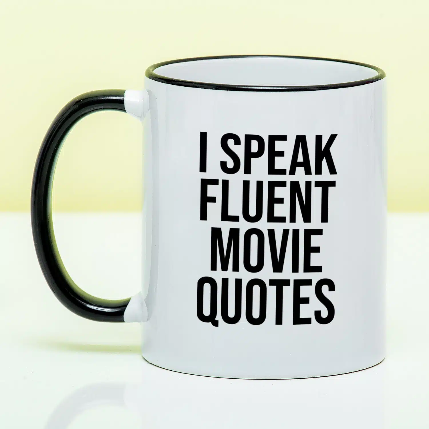 Brauchen Sie ein originelles Geschenk für einen Filmliebhaber? Die Tasse mit „I Speak Fluent Movie Quotes“ ist perfekt für diese Person! Auf dieser lustigen Tasse steht der Text: I Speak Fluent Movie Quotes. Für Leute, die Filme öfter zitieren als einem lieb ist und am liebsten pausenlos im Kino sitzen. Das Gute daran ist, dass die Tasse einfach in die Spülmaschine gestellt werden kann und der Beschenkte so Zeit hat, noch mehr Filme anzuschauen.