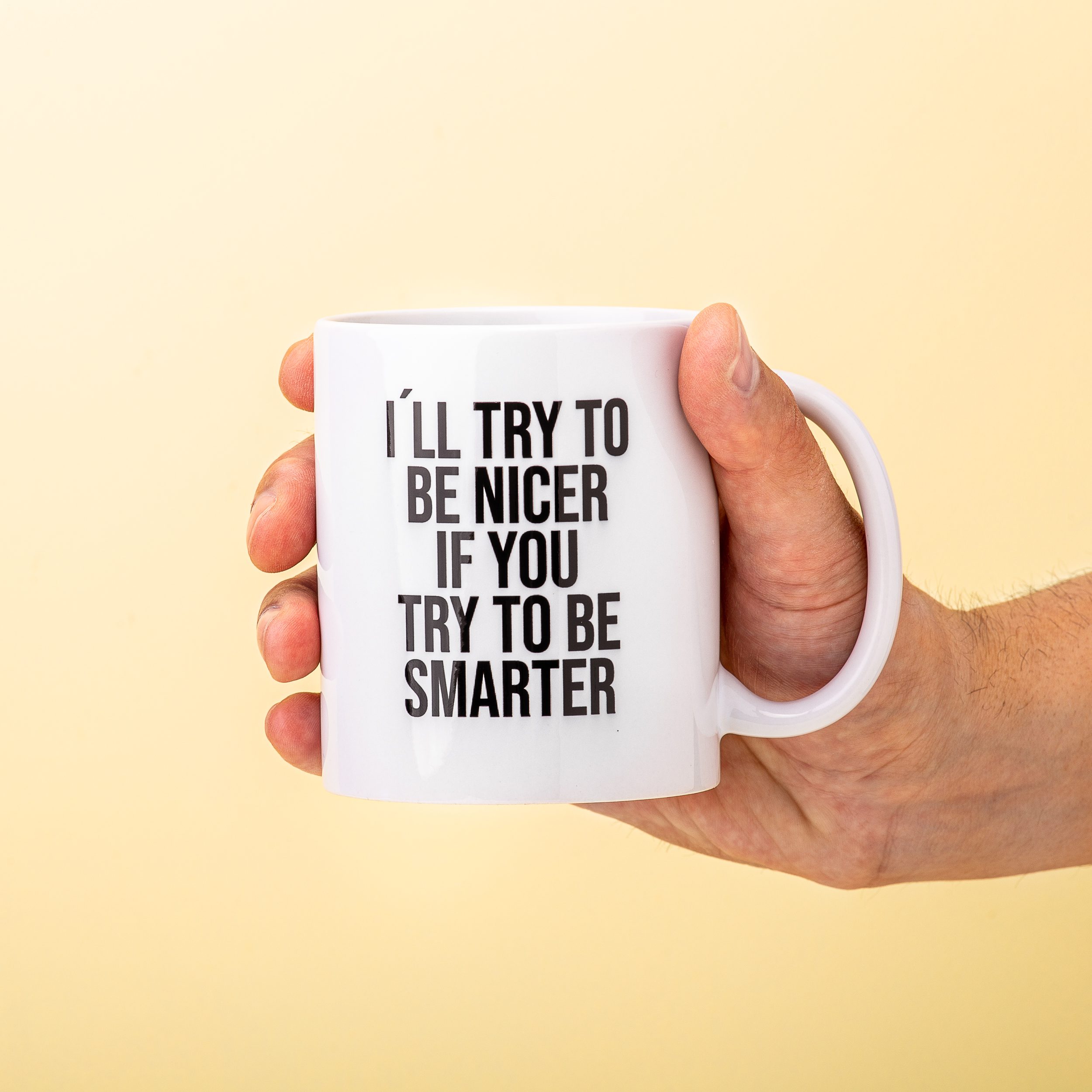 Stรถrst du dich oft an dummen Bemerkungen und verhรคltst dich dann ein wenig unfreundlich? Vielleicht kรถnntest du das nรคchste Mal etwas netter sein. Aber dann mรผssen die Leute, die dumme Bemerkungen machen, auch versprechen, dass sie schlauer handeln. Mit der Tasse I’ll Try To Be Nicer If You Try To Be Smarter machst du diese neue Regelung auf einmal klar allen deinen Kollegen deutlich. Wir sind uns nicht sicher, ob das dich beliebter bei der Arbeit macht, aber das wirst du bald herausfinden.