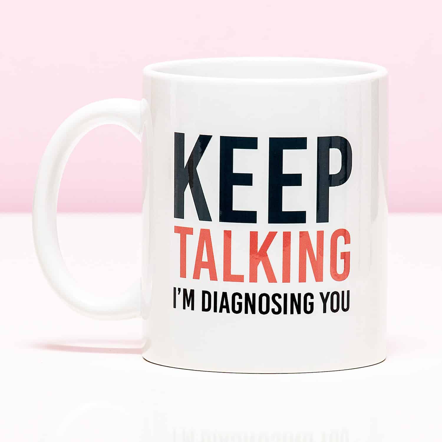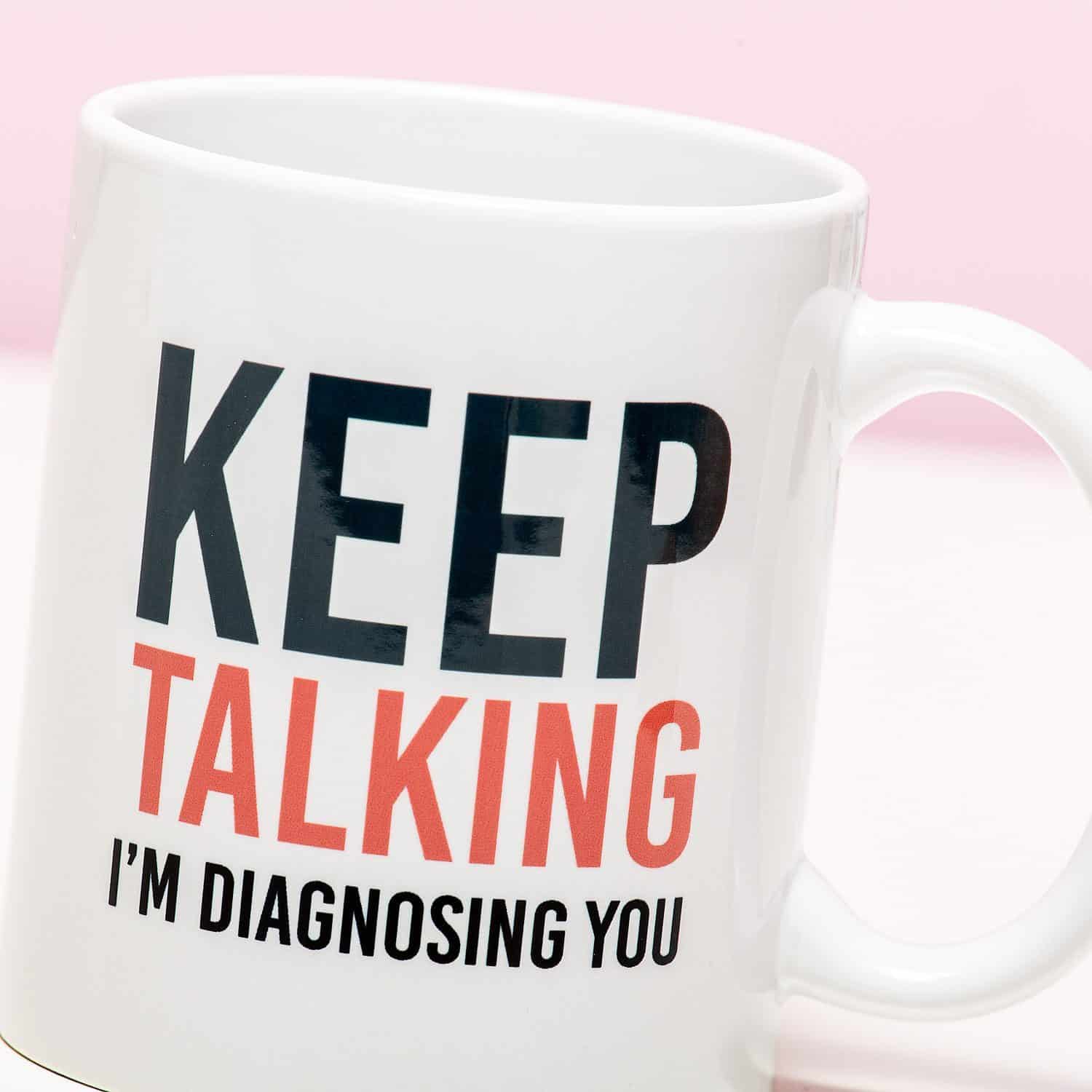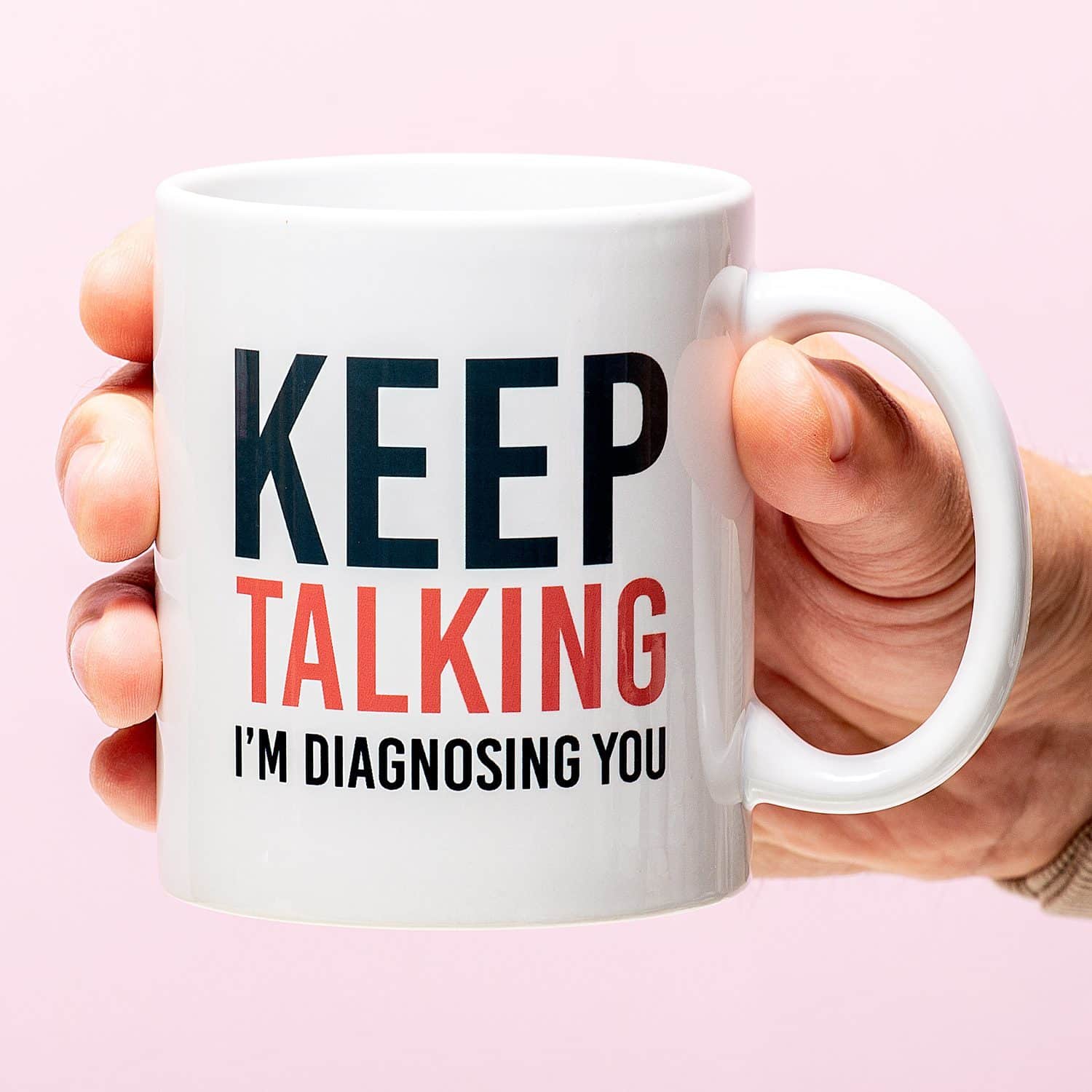Die meisten Dinge, die wir verkaufen, eignen sich sehr gut als Geschenk. Aber die Tasse Keep Talking solltest du besser selbst behalten. Auf der Tasse steht der Text: Keep talking, Iโm diagnosing you. Perfekt fรผr die Verwendung in der Schule oder bei der Arbeit. Nimm sie mit zu einem langweiligen, endlosen Meeting, und du hast zumindest die Lacher auf deiner Seite.