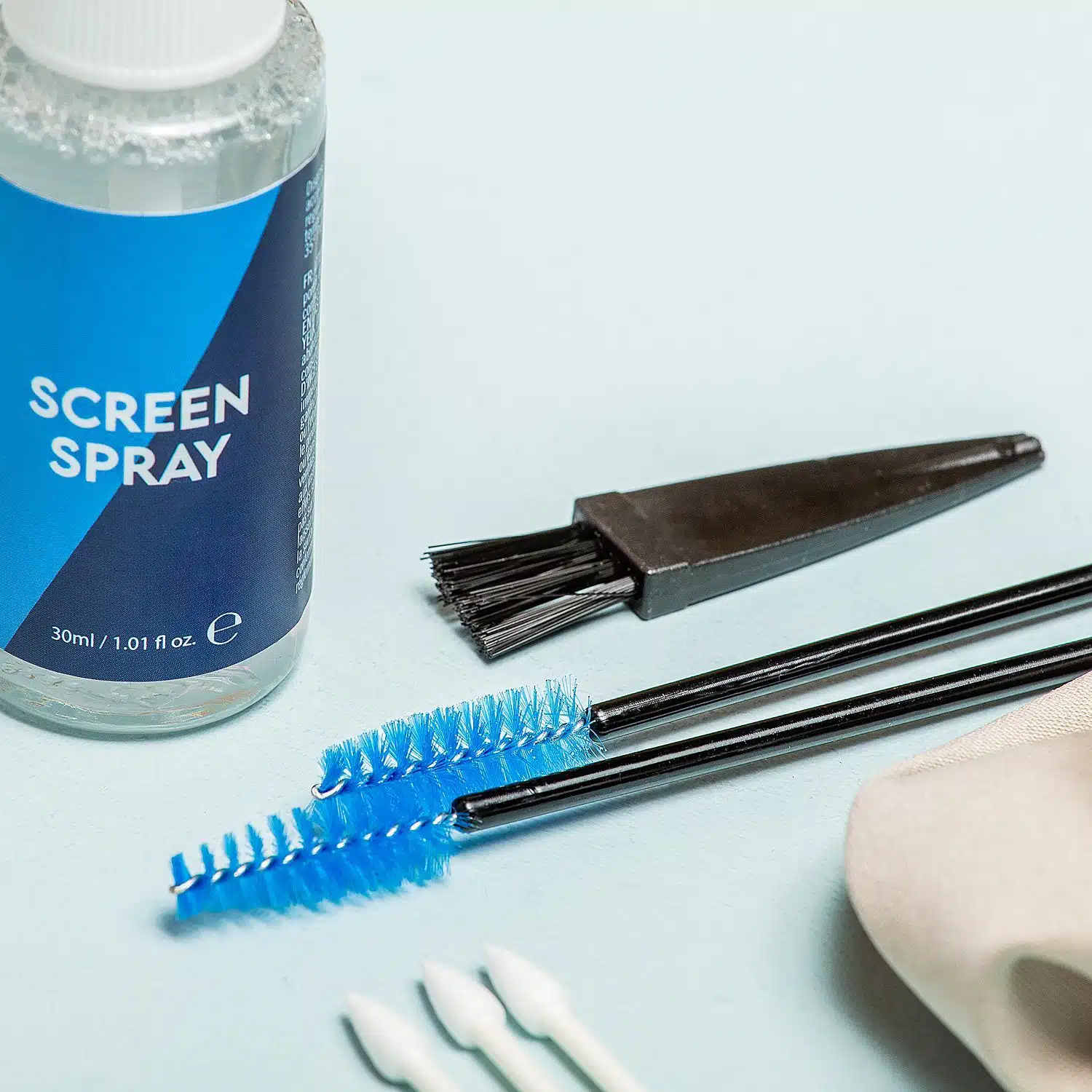 • Mit Bรผrsten, einem Mikrofasertuch und Bildschirmspray