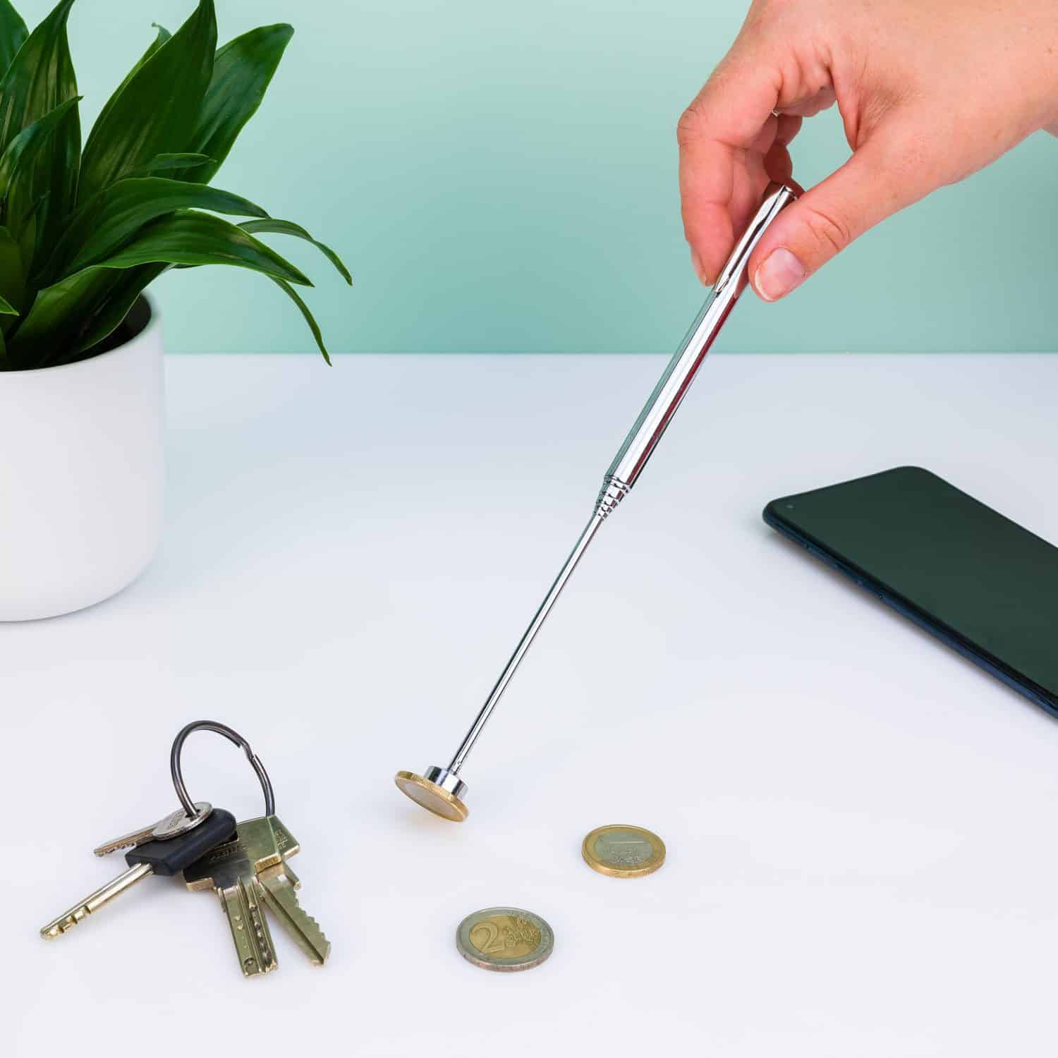 Ein heruntergefallenes Mรผnzstรผck hinter der Heizung aufheben oder deinen Schlรผsselbund aus einem Schacht fischen: Das ist mรถglich mit dem Teleskopmagnet. Ein praktisches Hilfsmittel, wenn du dich schlecht bรผcken kannst oder irgendwo nicht mit deinen Fingern hinkommst. Der starke Magnet hilft dir dabei, metallische Gegenstรคnde bis zu etwa 900 Gramm aufzuheben. Der Stiel ist bis zu einer Lรคnge von etwa 62 Zentimetern ausziehbar. Der Magnet sieht aus wie ein Stift und kann einfach in deiner Brusttasche verstaut werden.