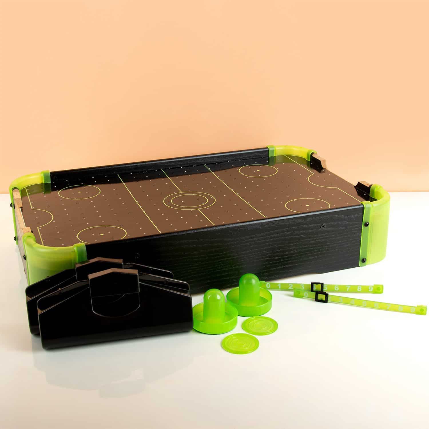 Liebst du es, Airhockey zu spielen, mรถchtest aber nicht immer dafรผr bezahlen? Mit dem Tisch-Airhockey-Spiel musst du das nicht mehr. Mit diesem Set kannst du einfach zu Hause am Kรผchentisch Airhockey spielen. In der Verpackung findest du einen kompakten Airhockey-Tisch, den du auf den Esstisch, die Kรผcheninsel oder einen Schreibtisch stellen kannst. AuรŸerdem bekommst du natรผrlich zwei Paddles und zwei Pucks. Durch den Einsatz von Batterien funktioniert der Airhockey-Tisch tatsรคchlich mit Luft. Dank der neongrรผnen Glow-in-the-dark-Elemente sieht dieses Spiel besonders cool aus.