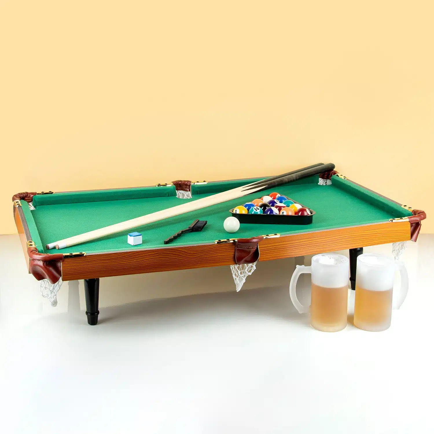 Du möchtest gerne Billard spielen, hast aber weder Platz noch Geld für einen eigenen Billardtisch und keine Zeit, jeden Tag in die Kneipe zu gehen? Das Tischbillard ist die ideale Lösung: Mit diesem Tischbillard kannst du zu Hause spielen. Der Tisch hat eine Größe von 90 x 50 Zentimetern und passt problemlos auf deinen Esstisch. Es ist ein komplettes Set: Du bekommst sechzehn Kugeln, ein Dreieck, Billardkreide, eine Bürste und natürlich zwei Queues. Wen forderst du zuerst zu einer Partie Billard heraus?