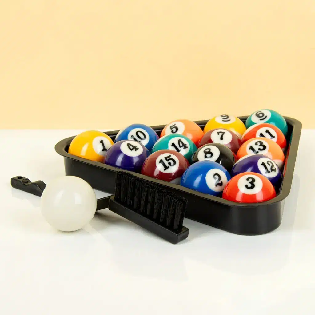 - Inklusive zwei Queues, sechzehn Kugeln, Dreieck, Billardkreide und Bürste