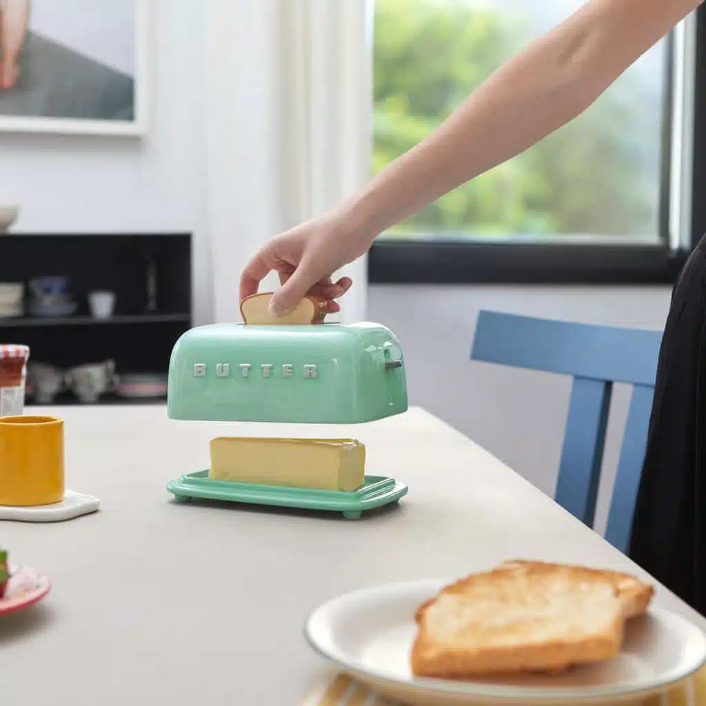 Die Toasty Butterdose von Balvi sieht aus wie ein Mini-Toaster einer ikonischen Marke und hat eine Toastscheibe als Griff. Diese grรผne Keramik-Butterdose hรคlt deine Butter bei Raumtemperatur cremig oder kรผhl im Kรผhlschrank. Supersรผร zum Aufstellen auf dem Tisch oder der Arbeitsplatte und so hast du immer weiche Butter zur Hand. Diese Butterdose ist das perfekte Geschenk fรผr jeden, der schรถne Kรผchenaccessoires liebt.