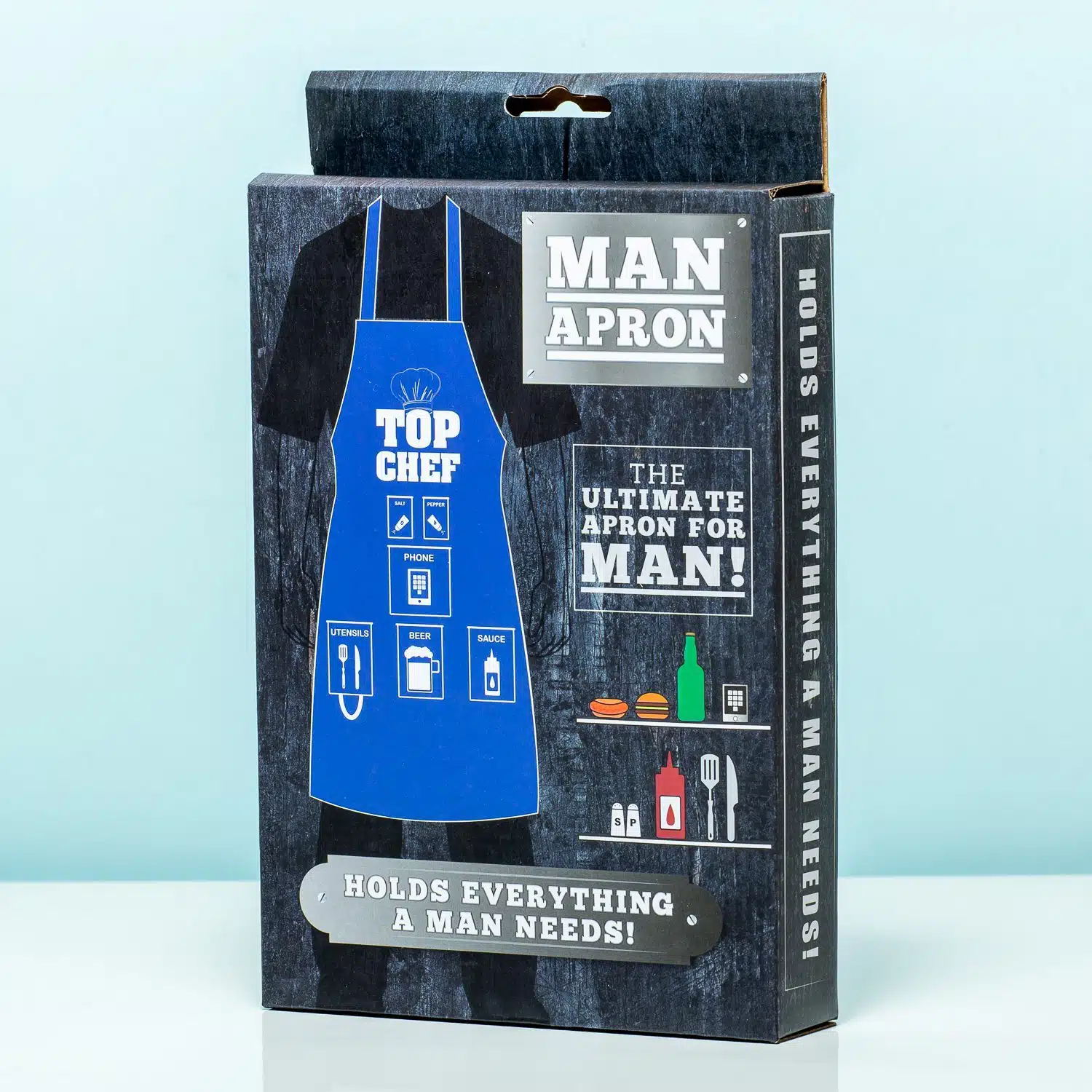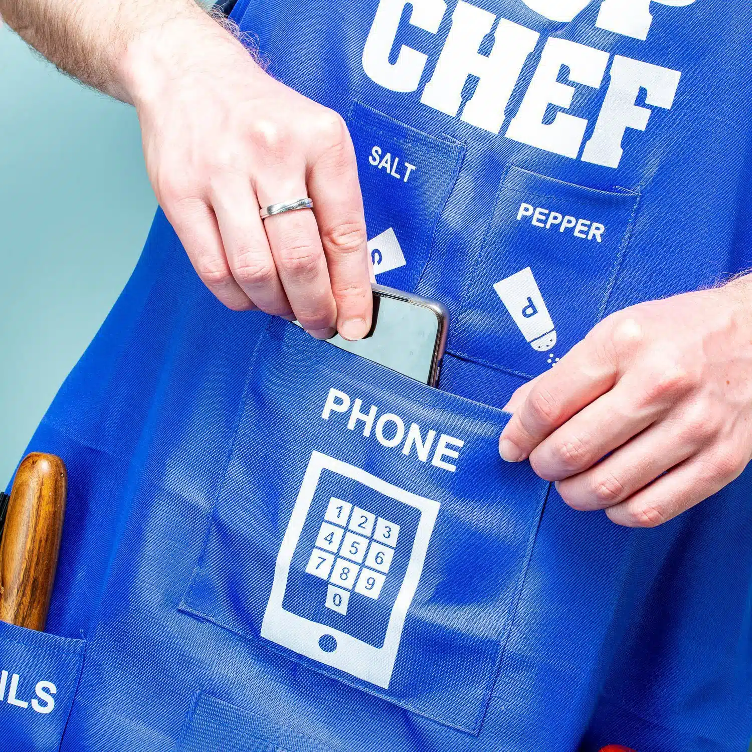 Wer kocht zu Hause am meisten? Wenn Sie Ihren Mann dazu animieren möchten, öfter hinter dem Herd zu stehen, dann ist die Top Chef Schürze für Männer ein schönes Geschenk für ihn. Diese Küchenschürze von Fizz hat allerhand praktische Fächer: für seine Küchenutensilien, Salz und Pfeffer, sein Telefon, eine Flasche Soße und natürlich für eine Flasche Bier. Die Küchenschürze gibt ihm auch einen Klaps auf die Brust, auf welcher „Top Chef“ zu lesen ist. Diese Kochschürze ist alles, was Mann in der Küche oder hinter dem Grill braucht!