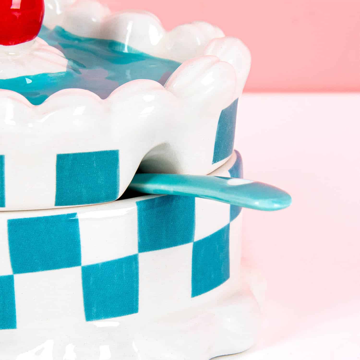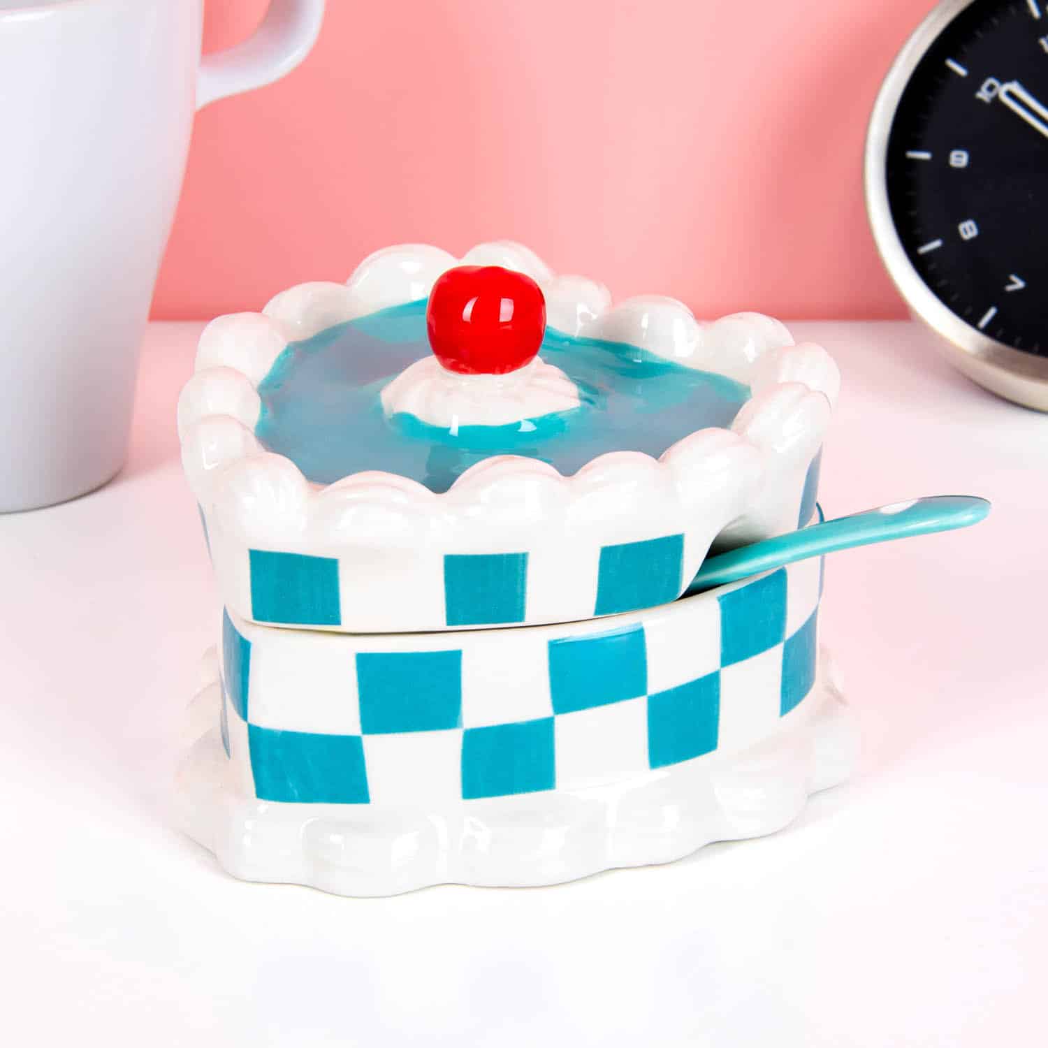 Mach dein Leben ein Stรผck sรผรer โ mit der Torten-Zuckerdose von DOIY. Diese niedliche Zuckerdose sieht aus wie ein kleines Tรถrtchen in Herzform und ist ein echtes Highlight auf dem Kaffeetisch. Sie erinnert nicht nur optisch an ein zuckersรผรes Gebรคck, sondern sorgt auch dafรผr, dass dein Kaffee oder Tee noch besser schmeckt. Die Sahne-Deko, die Kirsche auf dem Deckel und der passende blaue Lรถffel runden das Design perfekt ab.
