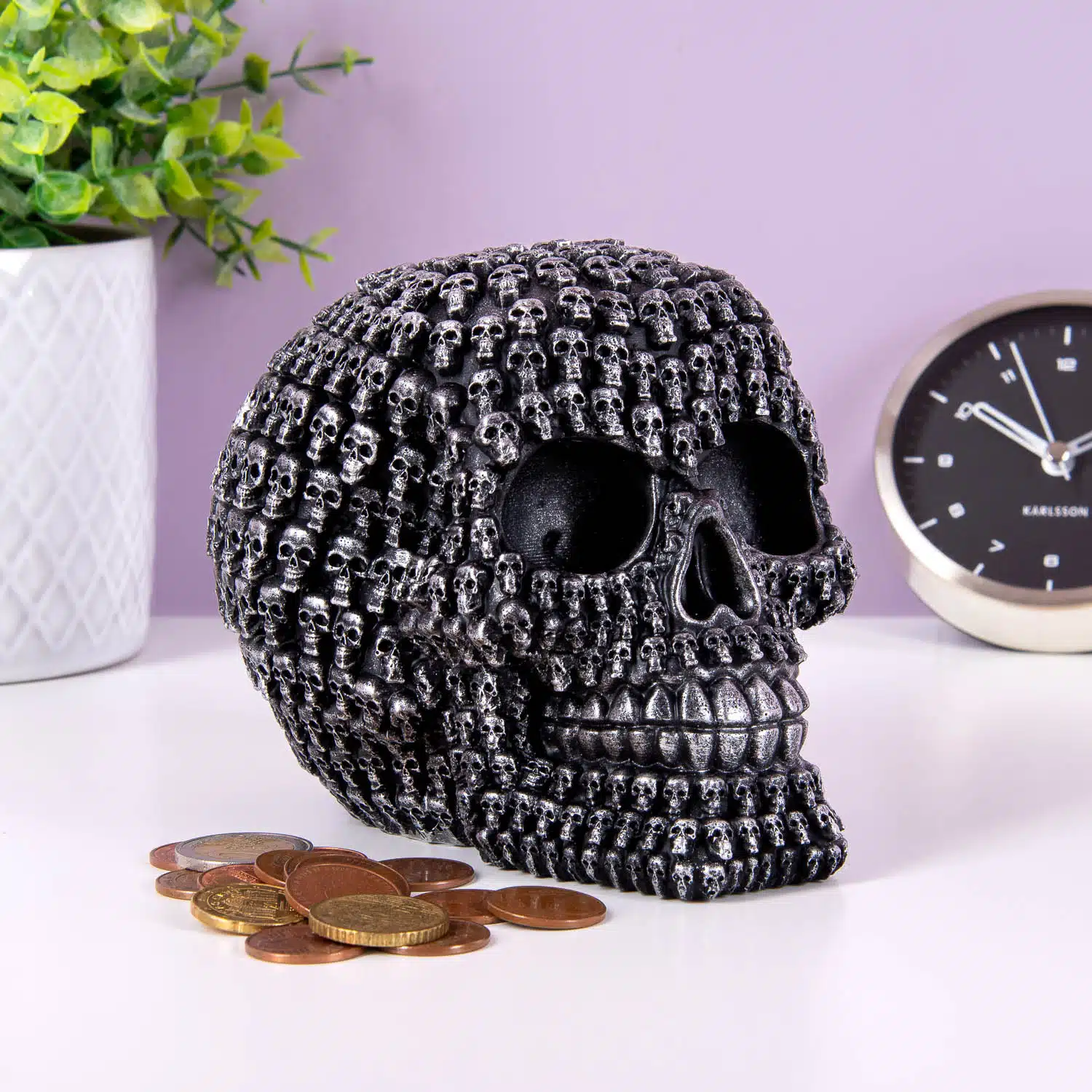 Totenkopf-Spardose mit vielen kleinen Schädeln
