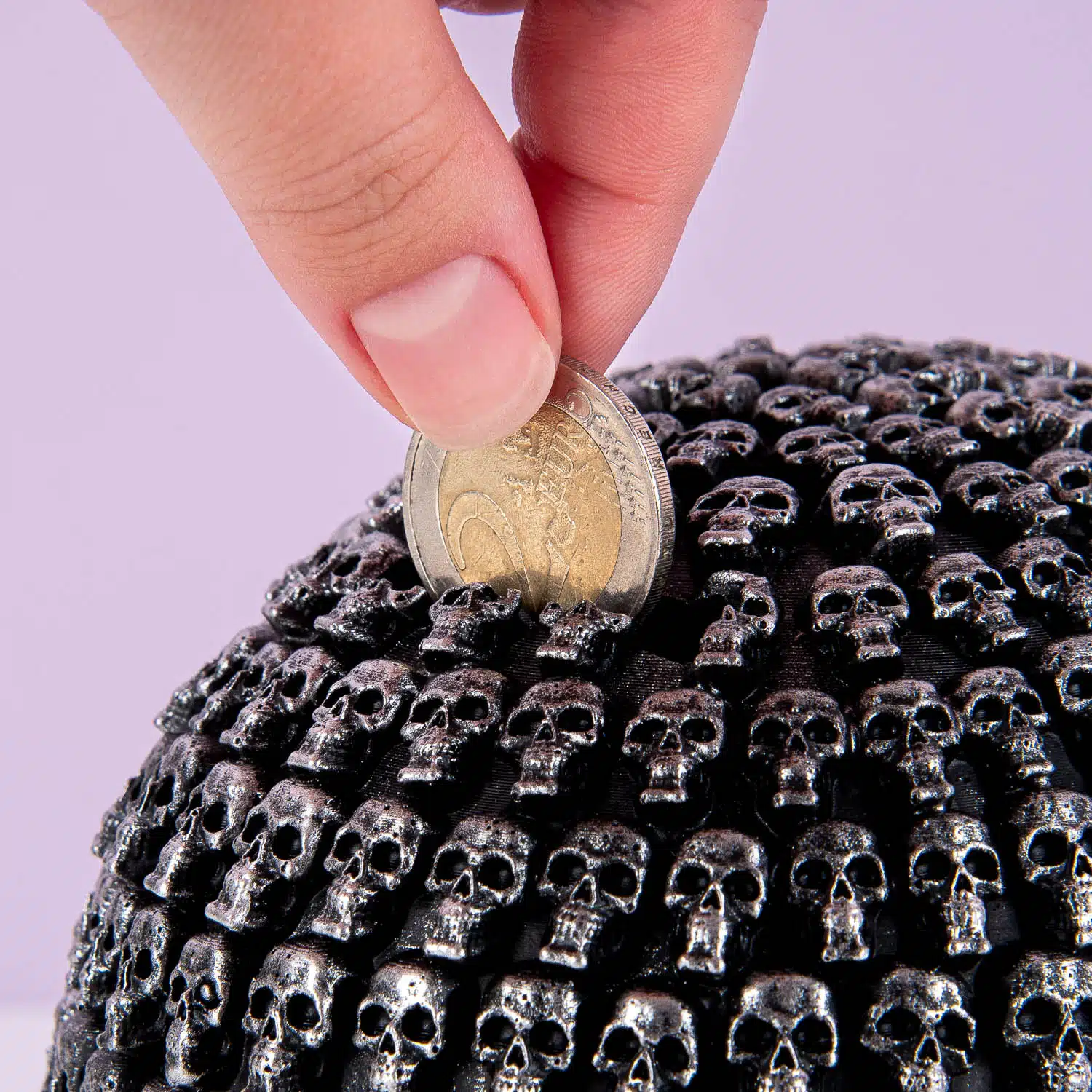 Willst du verhindern, dass dein kleiner Bruder dein Erspartes klaut? Die Totenkopf-Spardose mit Schloss ist die perfekte Lösung, um Langfinger im Haushalt abzuschrecken. Diese gruselige Spardose hat die Form eines Totenkopfes, verziert mit Dutzenden kleiner Schädel. Und das Beste: Sie ist mit einem Schloss ausgestattet. Verstecke den Schlüssel gut, dann kommt niemand an dein Geld!