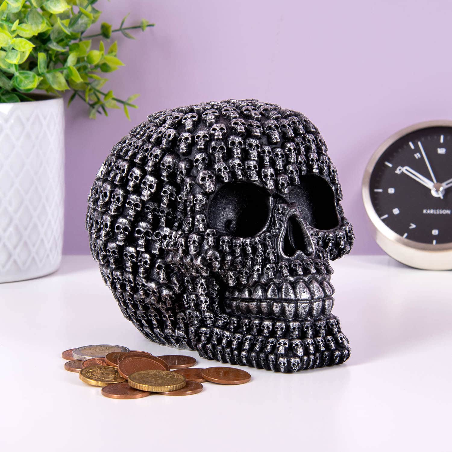 Totenkopf-Spardose mit vielen kleinen Schรคdeln