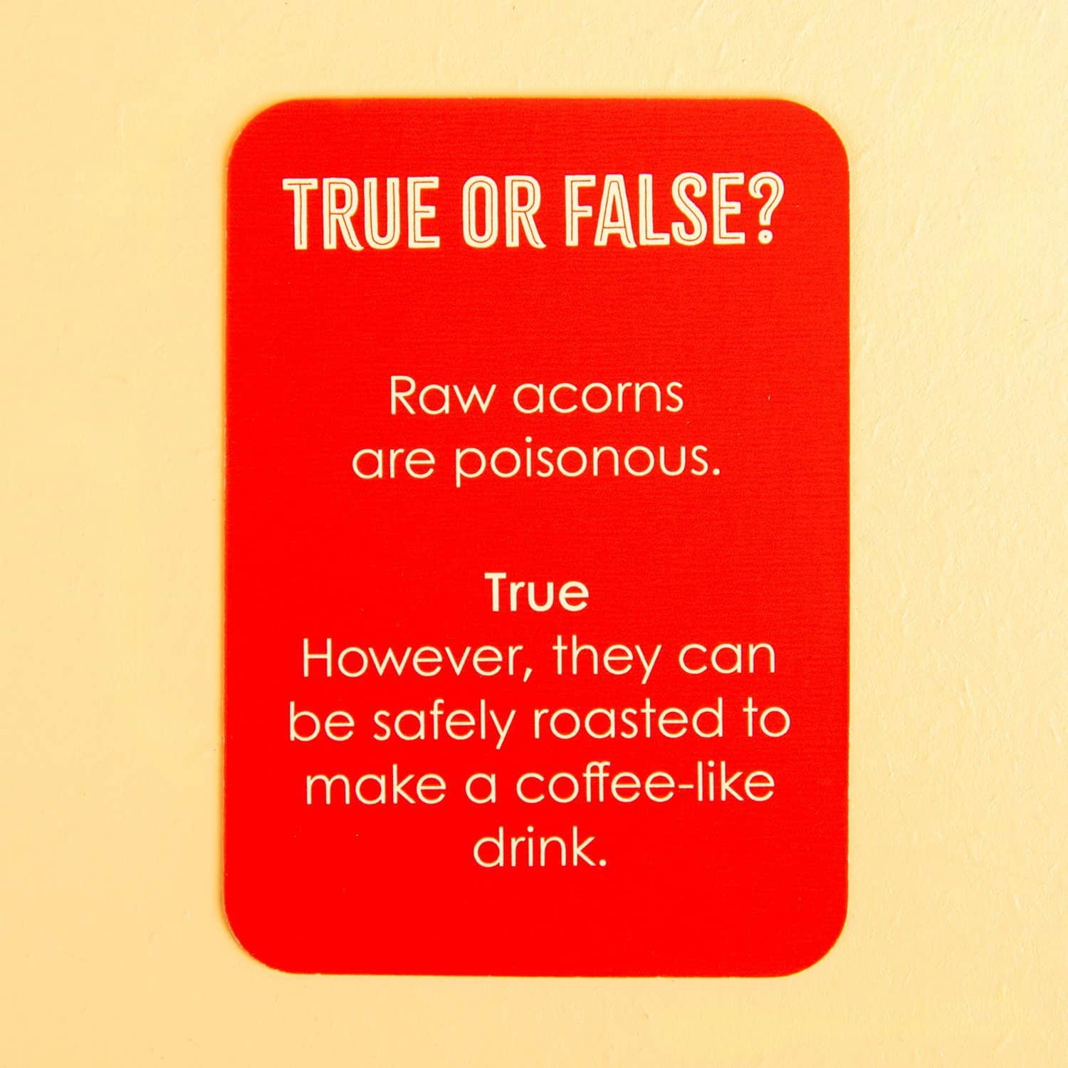 Woher stammt der Name Amaretto? Kann man rohe Eicheln essen? Das Spiel True or False in einer Dose von Talking Tables ist ein Spiel, bei dem du blitzschnell antworten musst, ob die vorgelesene Tatsache wahr oder falsch ist. Auf den Karten stehen Fragen wie: Tutanchamuns Grab wurde in den 1920er Jahren entdeckt (wahr) und Die Feuersteins wohnen in einer Stadt namens Rubblesville (falsch). Das Set ist in einer praktischen Dose verpackt, wodurch es leicht mitzunehmen ist, und enthรคlt vier Tafeln mit den Aufschriften โTrueโ und โFalseโ.