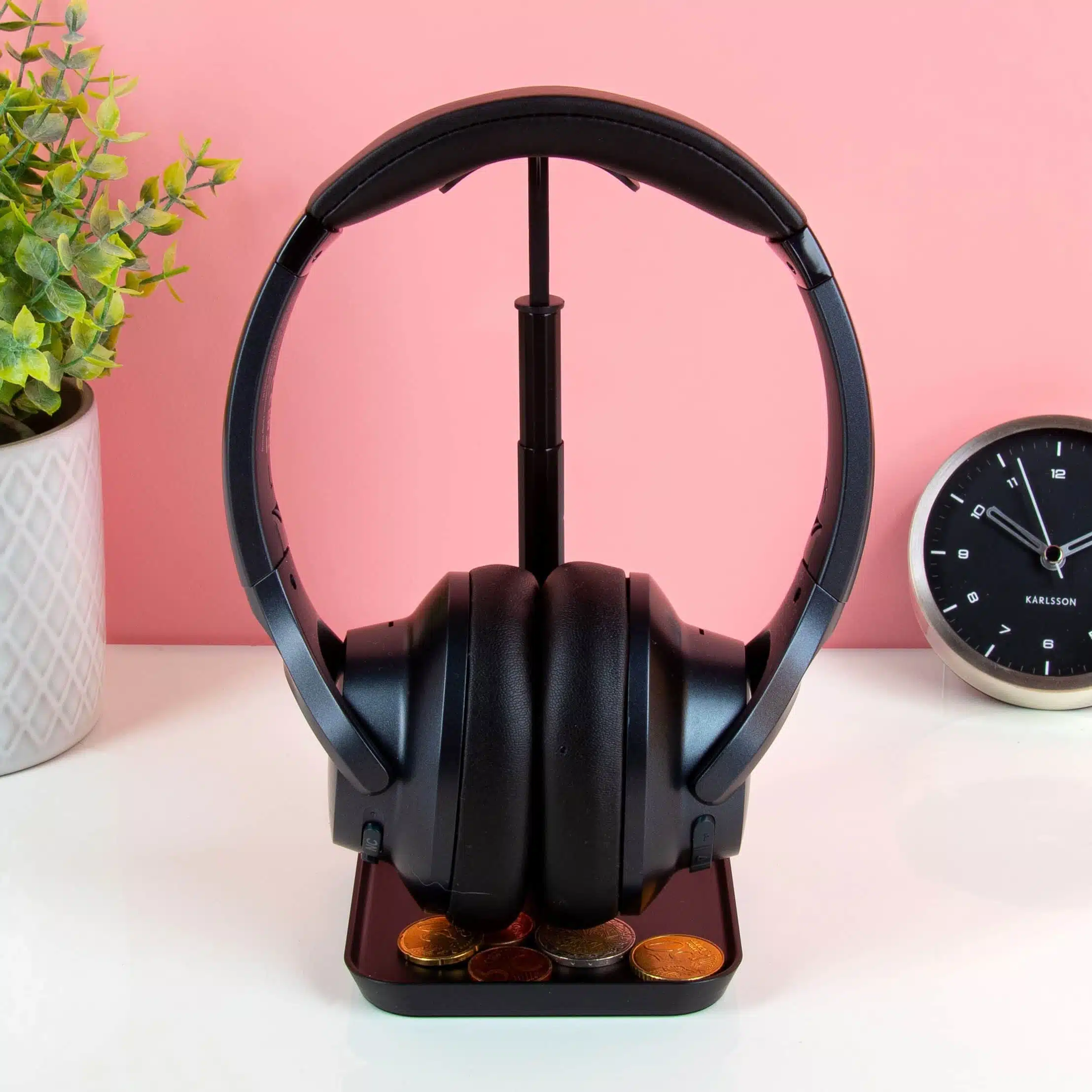 Liebst du einen aufgeräumten Arbeitsplatz? Dann ist der verstellbare Kopfhörerständer von Kikkerland genau das Richtige für dich. Dieser praktische Ständer bietet ausreichend Platz für deinen Kopfhörer, da er höhenverstellbar ist. Zusätzlich hat er ein praktisches Ablagefach an der Basis, in dem du Schlüssel, Kleingeld und dein Ladekabel verstauen kannst.