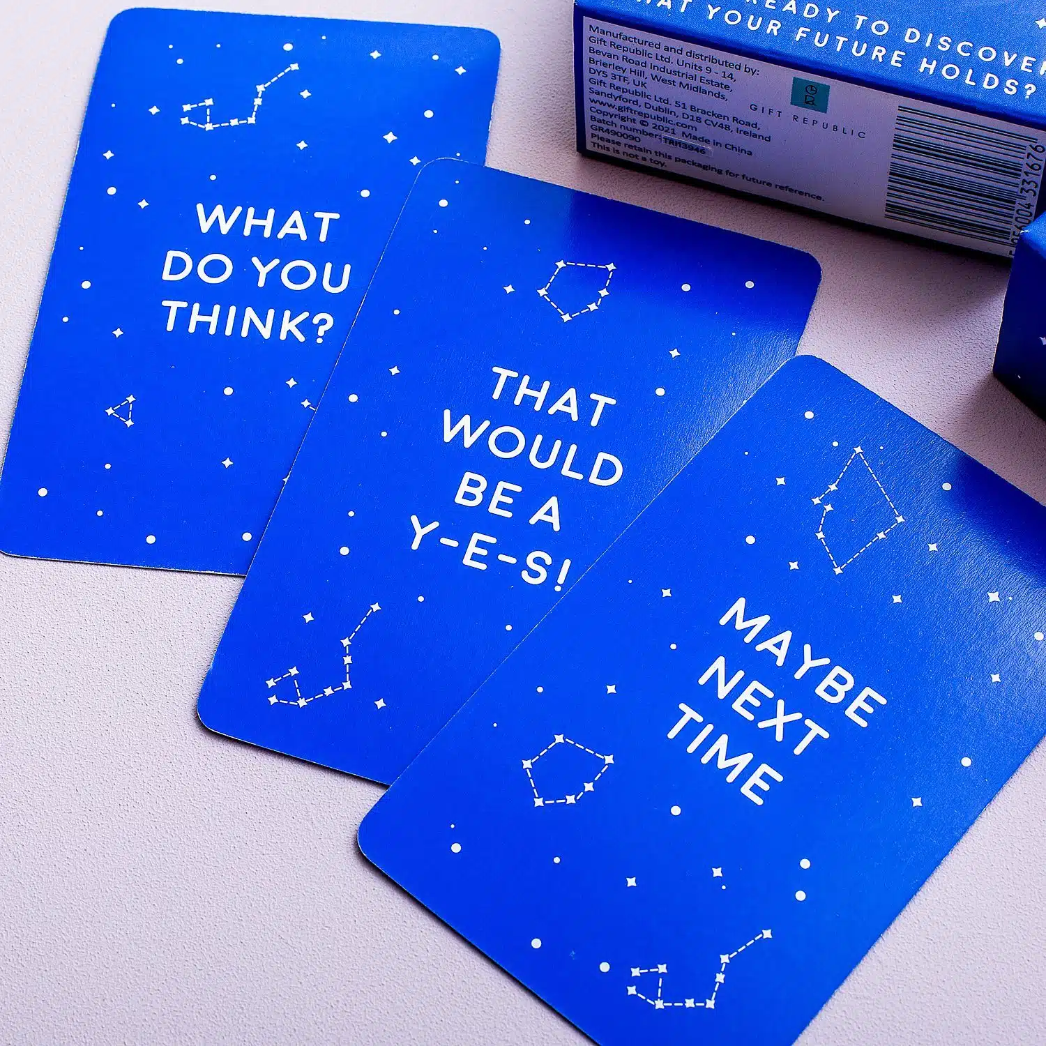 Du wolltest schon immer mal eine Wahrsagerin sehen? Ab sofort können Sie das zu Hause tun, mit den Future Predicting Cards von Gift Republic. Sie verwenden diese humorvollen Karten, wenn Sie Antworten auf drängende Fragen wünschen, z. B. ob Sie jemals Millionär werden.