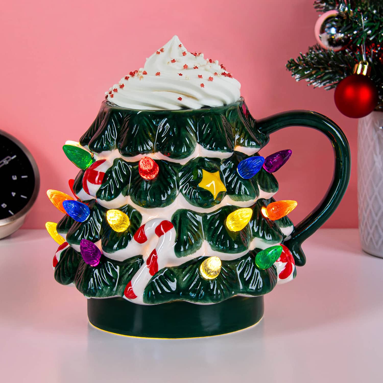 Kaffee? Tee? Glรผhwein? Egal, was du einschenkst โ die Weihnachtsbaum-Tasse mit LED-Beleuchtung von MikaMax macht jedes Getrรคnk zu einem Fest. Diese Tasse sieht aus wie ein frรถhlicher Weihnachtsbaum, komplett mit Lichtern, die wirklich leuchten. Ideal fรผr alle, die ihrem Getrรคnk ein Extra an Weihnachtsstimmung verleihen wollen. Perfekt fรผr unter dem Baum, die lustige Weihnachtsfeier oder einfach als Scherz fรผr den Kollegen, der schon im September Last Christmas summt.