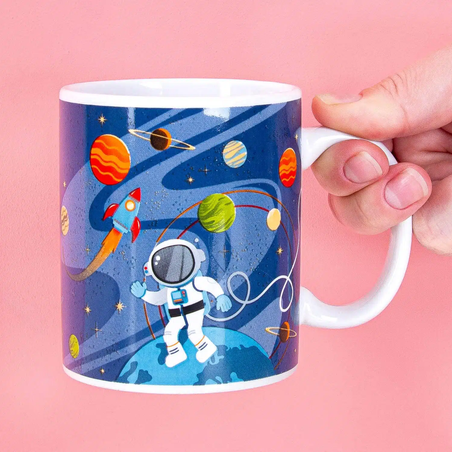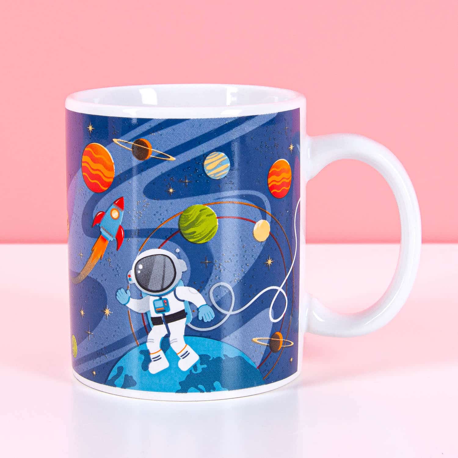 Tasse mit Weltraumthema und Henkel in Raketenform
