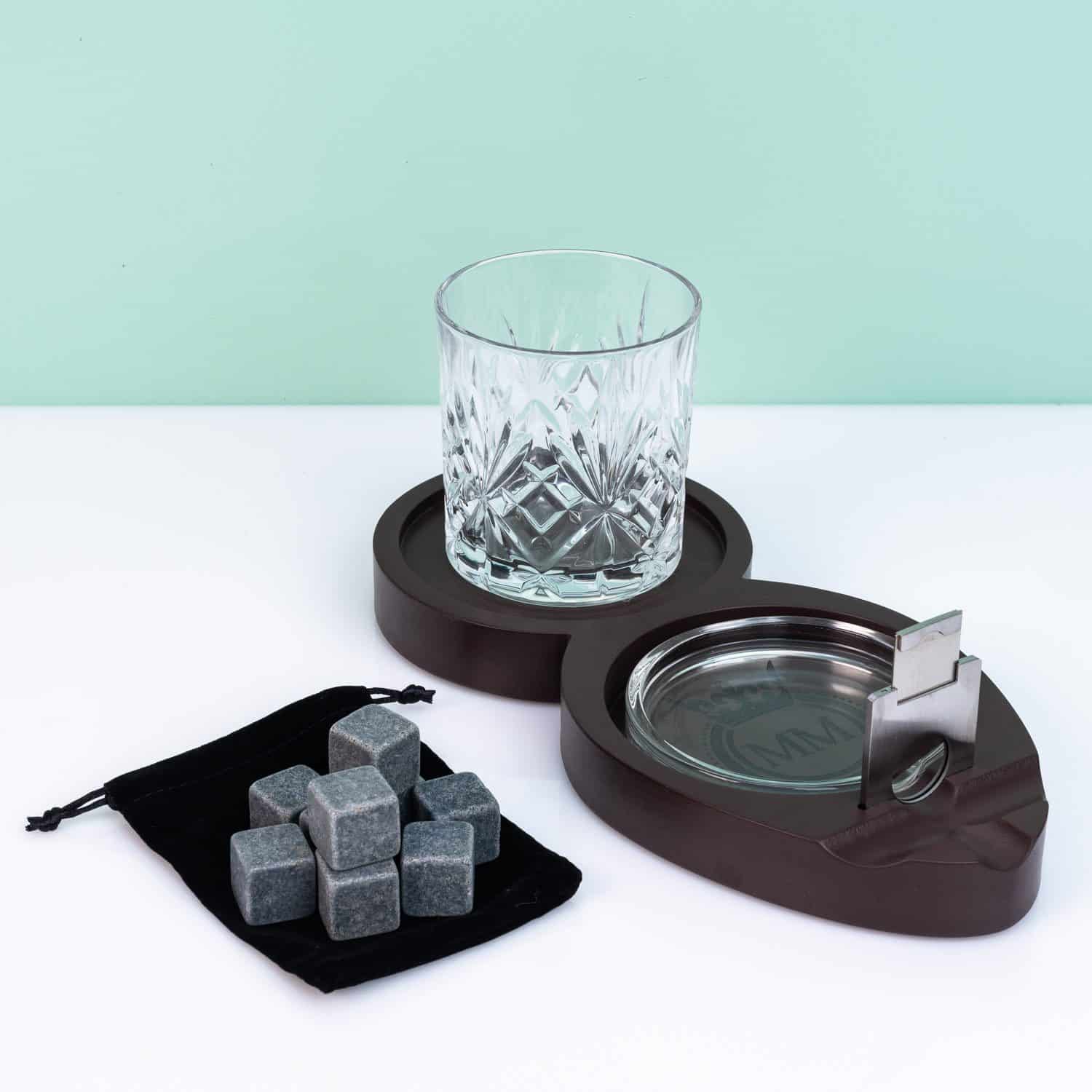 - Inhalt: Whiskeyglas, Tablett, Aschenbecher, Zigarrenschneider, neun Whiskeysteine in Samtbeutel