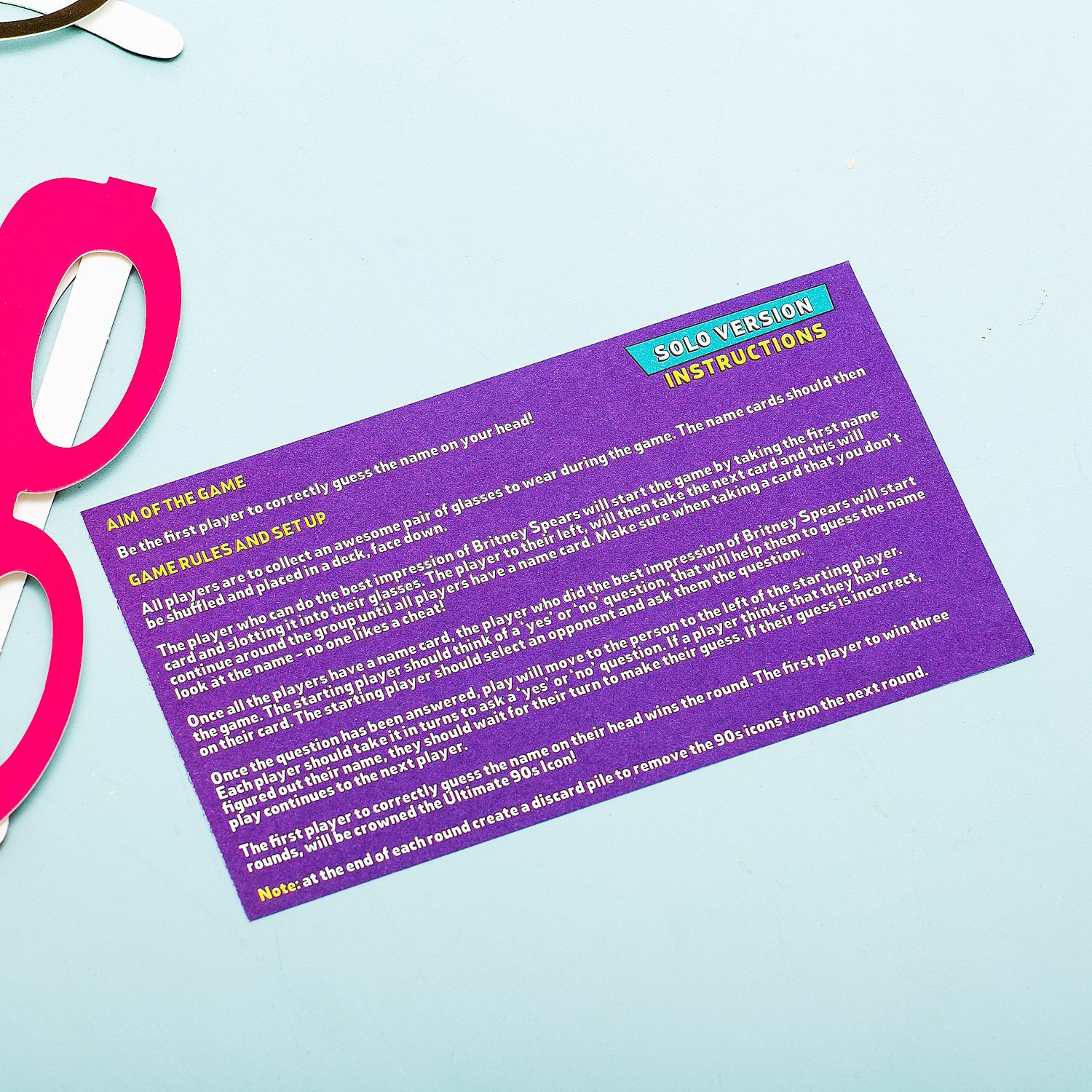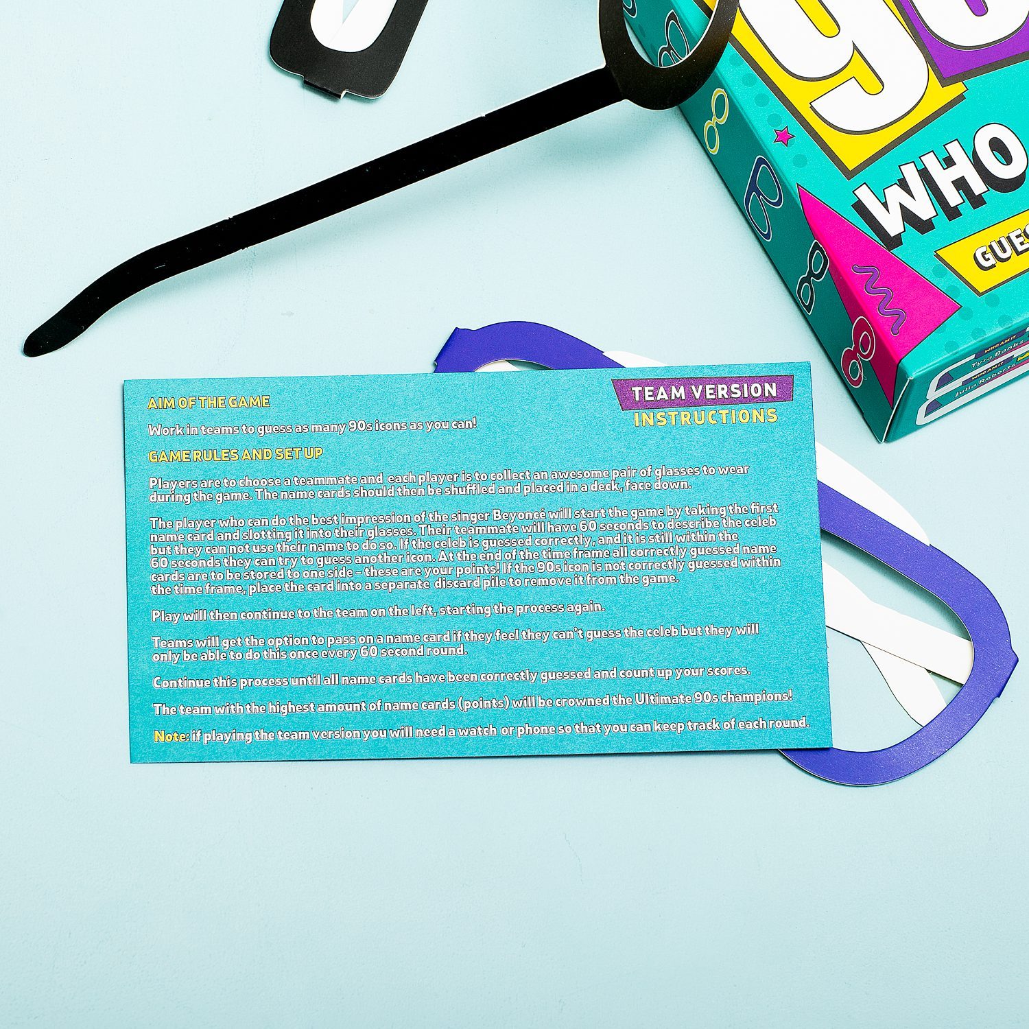 Boris Becker, Hulk Hogan, Jerry Springer und Britney Spears: allesamt Ikonen der 80er und 90er Jahre. Beim Who Am I Spiel von Gift Republic geht es darum, zu erraten, wer auf deiner Namenskarte steht. Ziehe eine der hundert Namenskarten aus dem Stapel und stecke sie in die spezielle Brille. So können andere sehen, wen du erraten musst. Ein lustiges Spiel für Leute, die die 80er und 90er Jahre bewusst miterlebt haben. Dieses Spiel ist in zwei Varianten erhältlich: 80s oder 90s.